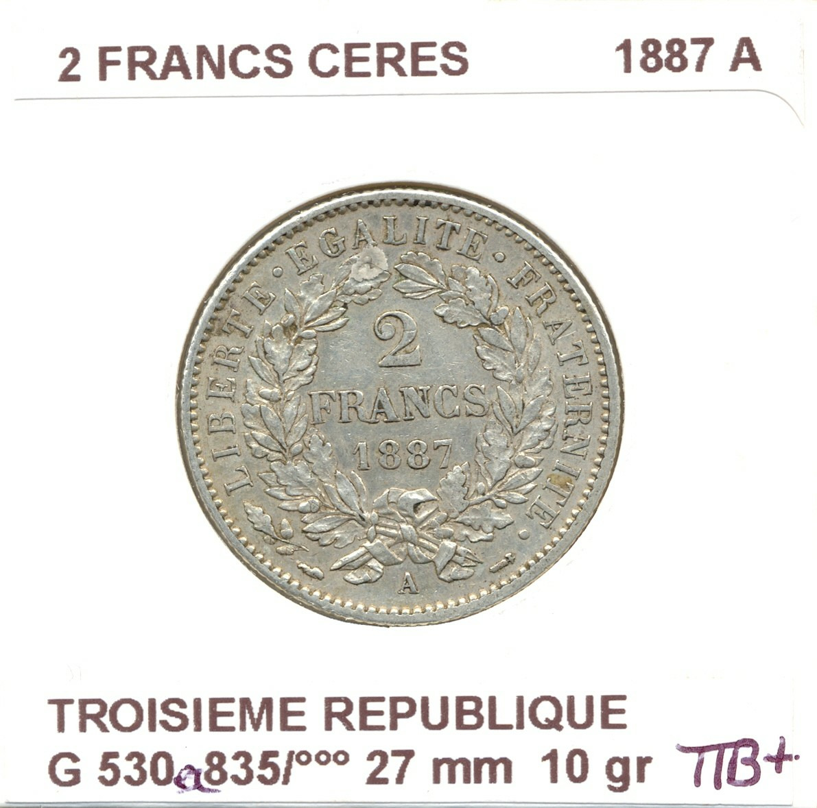 2 FRANCS CERES 1887 A TTB+