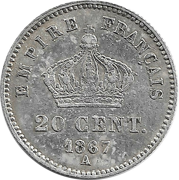 FRANCE 20 CENTIMES NAPOLEON III 1867 A TTB+