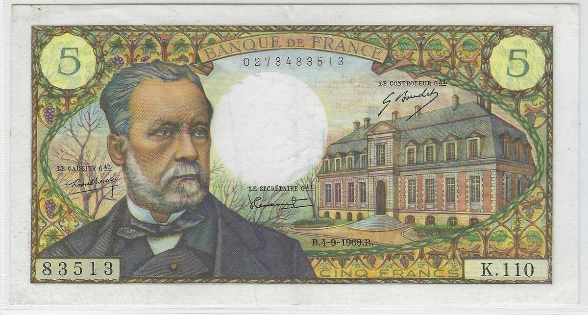FRANCE 5 FRANCS PASTEUR 4-9-1969 K.110 SUP