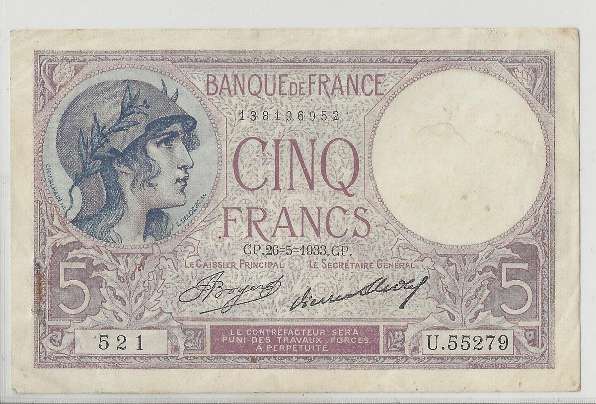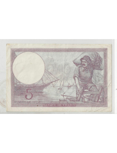 FRANCE 5 FRANCS U55279 VIOLET 26 05 1933 SUP. Gros épinglages.