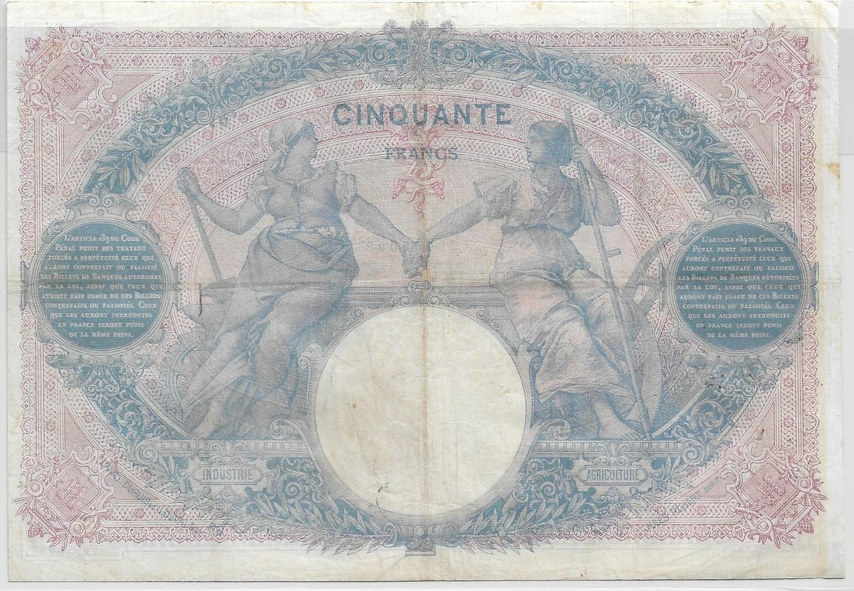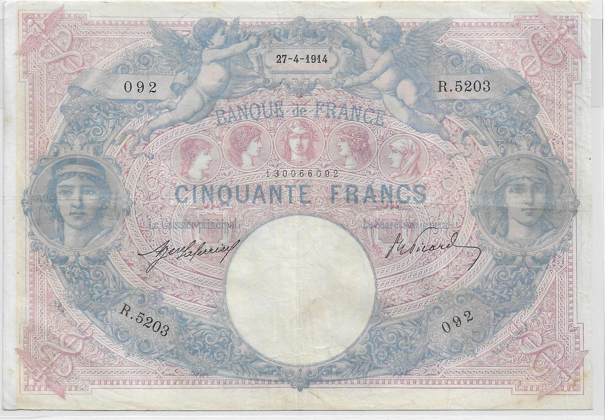 FRANCE 50 FRANCS BLEU ET ROSE SERIE R.5203 27-4-1914 TB+