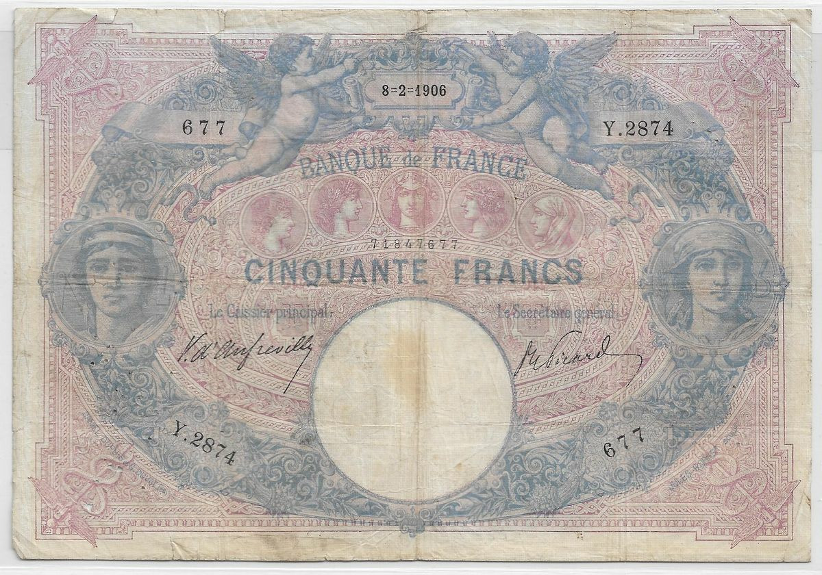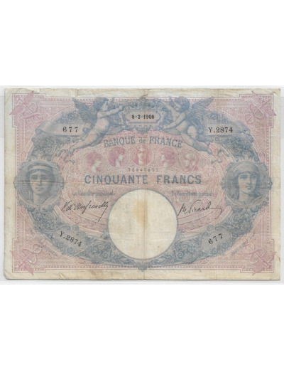 FRANCE 50 FRANCS BLEU ET ROSE SERIE Y.2874 8-2-1906 TB
