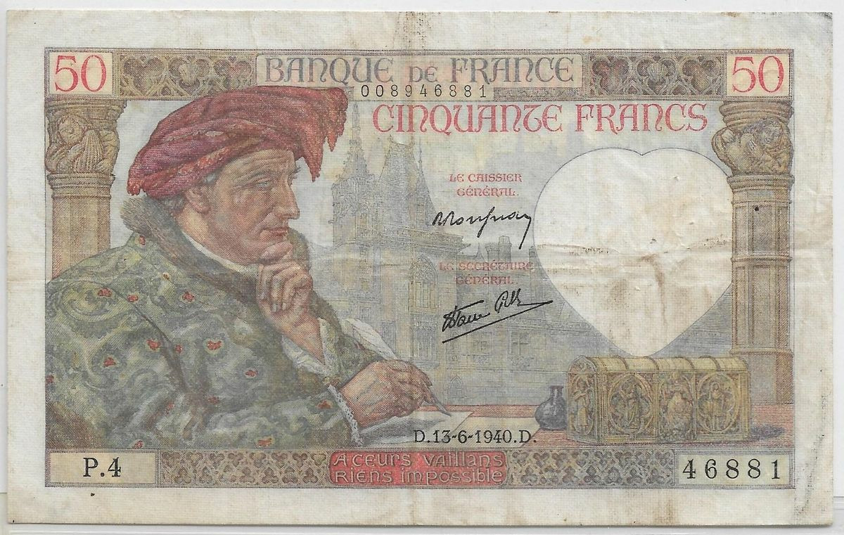 FRANCE 50 FRANCS JACQUES COEUR SERIE P.4 13-6-1940 TTB