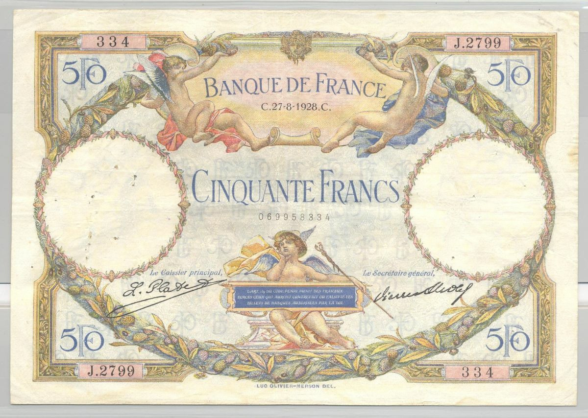 FRANCE 50 FRANCS L.O. MERSON SERIE J.2799 27-8-1928 TTB