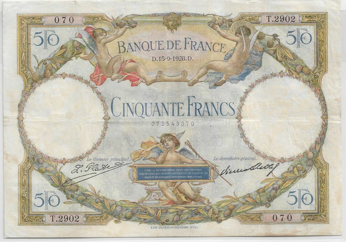 FRANCE 50 FRANCS L.O. MERSON SERIE T.2902 15-9-1928 TTB