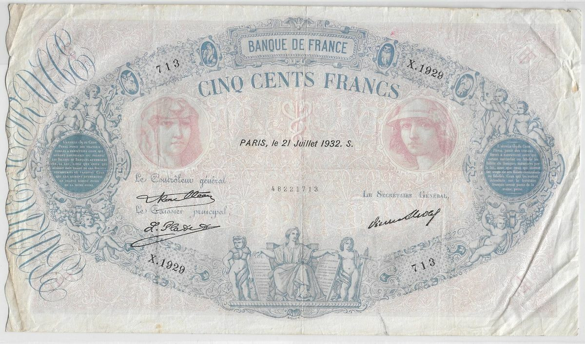 FRANCE 500 FRANCS BLEU ET ROSE X.1929 21 juillet 1932 TB+