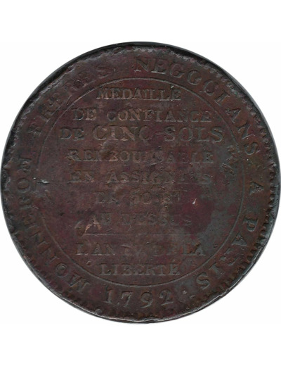 FRANCE MONNERON 5 SOLS PACTE FEDERATIF 1792 AN IV B+