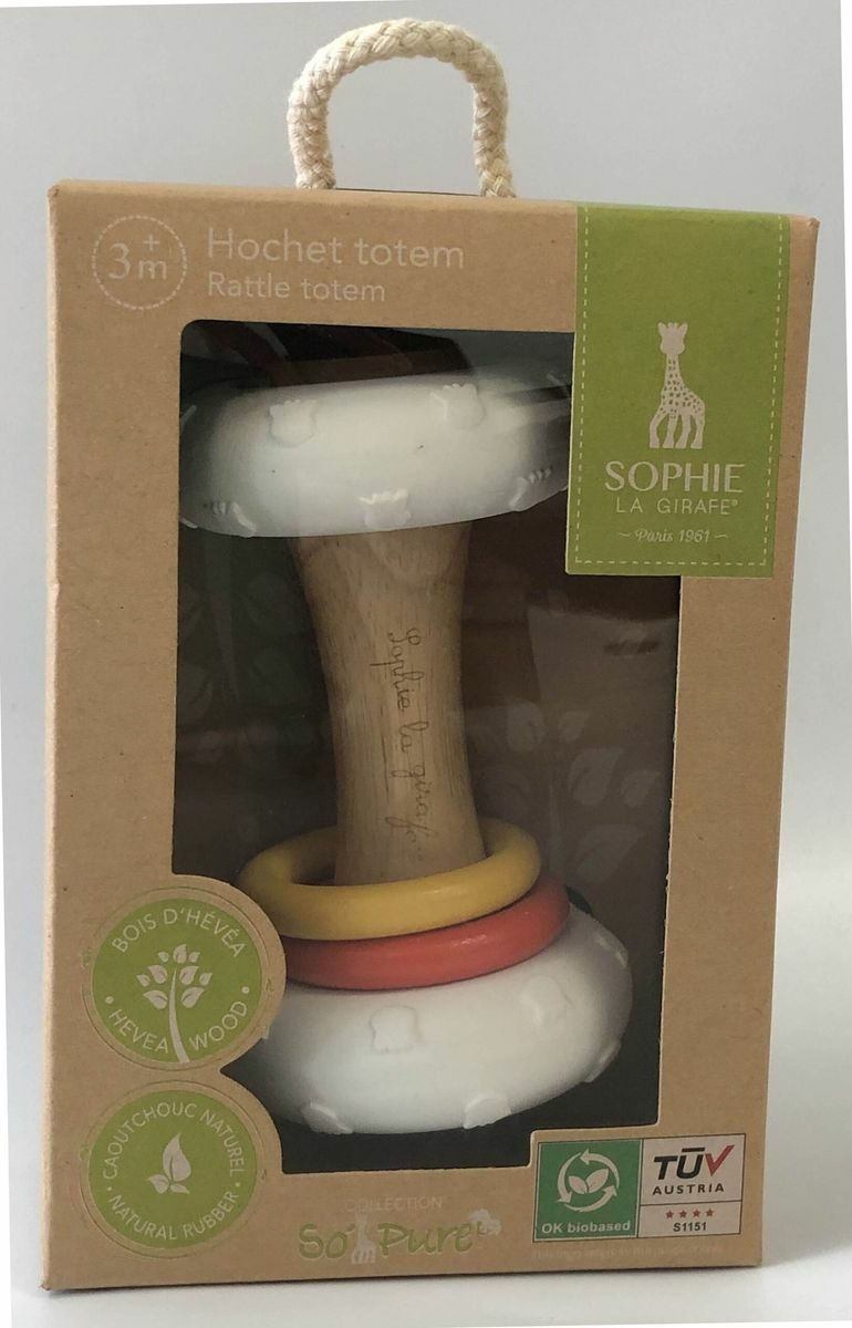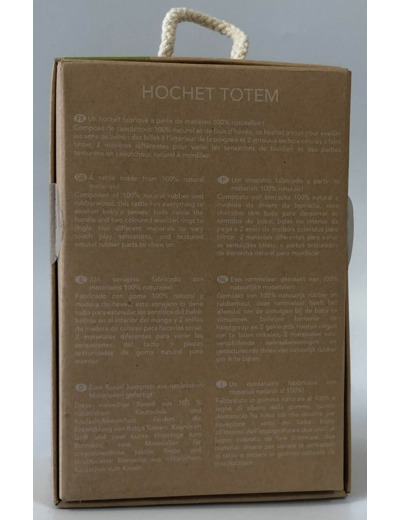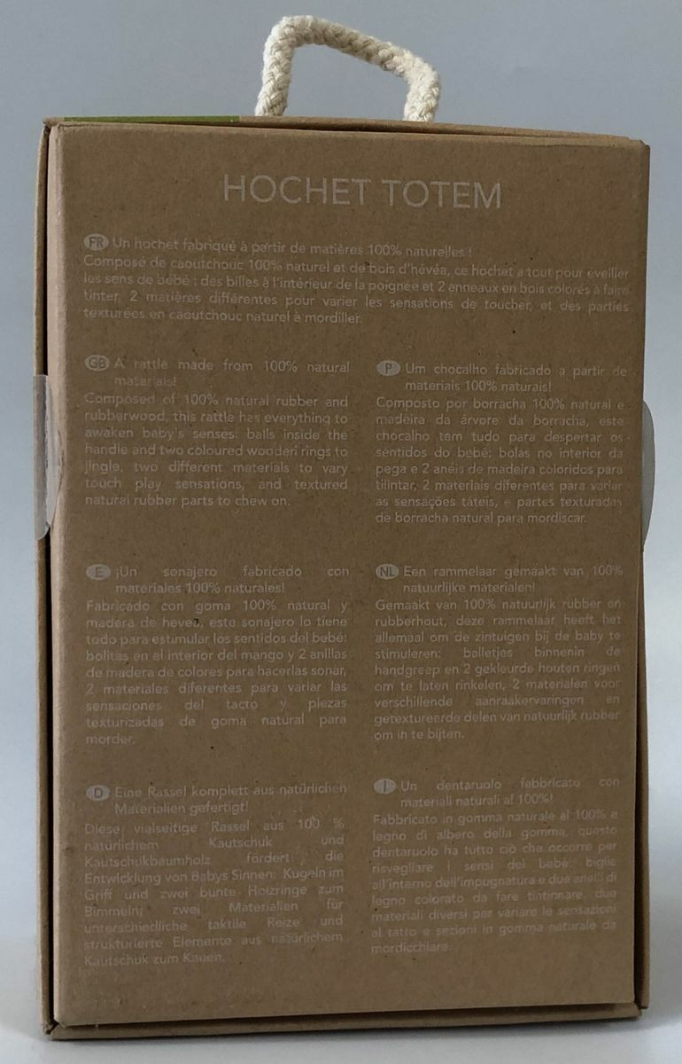 Hochet fabriqué a partir de matières 100% naturelles !composé de caoutchouc 100% naturel et de bois d'hévéa -Ce hochet a tout pour éveiller les sens du bébé -des billes a l'intérieur de la poignée et 2 anneaux en bois colorés a faire tinter -2 matières différentes pour varier les sensations de toucher et des parties texturées en caoutchouc naturel a mordiller -