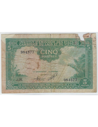 INDOCHINE FRANCAISE 5 PIASTRES NON DATE (1953) SERIE J.28 B+