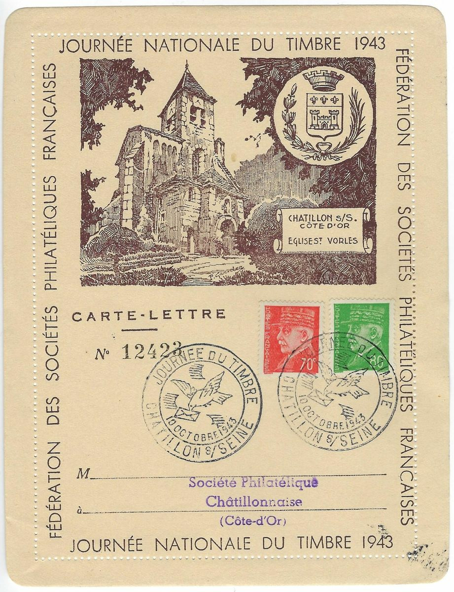 CARTE-LETTRE 12423 JOURNEE NATIONALE DU TIMBRE 1943 CHATILLON SUR SEINE 10 OCTOBRE 1943