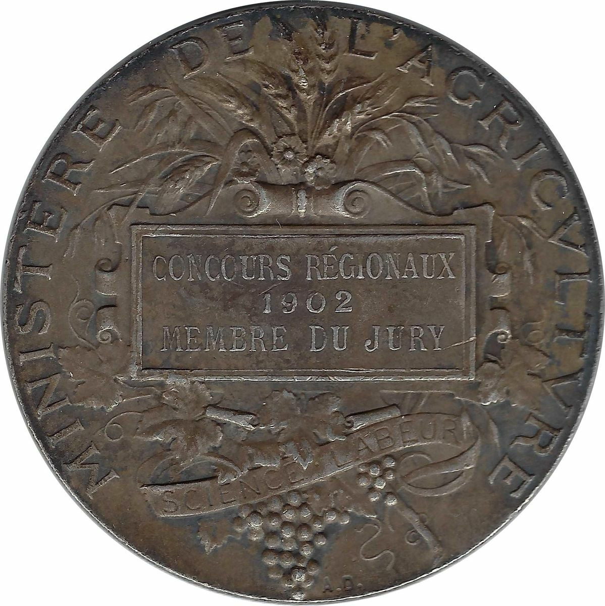 Avers: MINISTERE DE L'AGRICULTURE CONCOURS REGIONAUX 1902 MEMBRE DU JURY