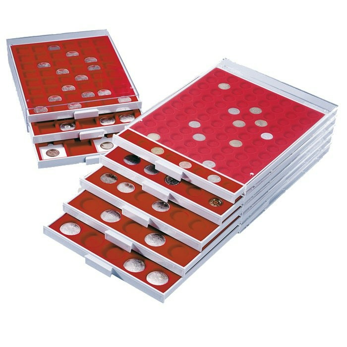 Tiroir gris, fond rouge avec 35 cases carrées pour monnaies d'un Ø 35 mm: 10 Marks, Krügerrand ou 10 euros commémoratives allemandes. Format extérieur (L/l/H) 236 x 303 x 20 mm.