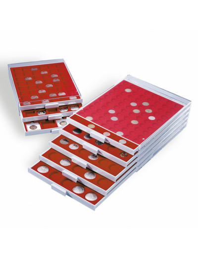 Tiroir gris, fond rouge avec 45 cases carrées de différentes tailles. Idéal pour offrir ou pour débuter une collectionner. Format extérieur (L x L x H) 236 x 303 x 20 mm.