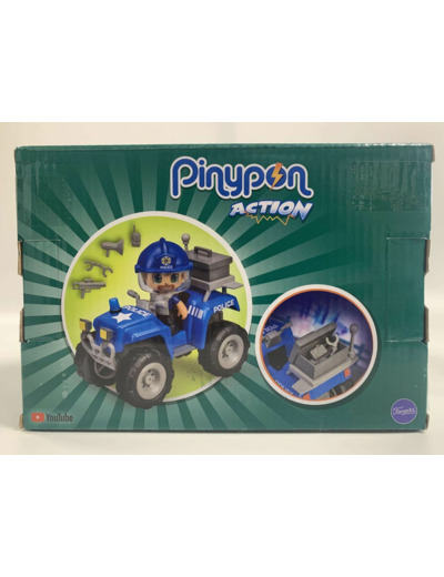 Contient : 1 figurine Pinypon Action + 1 quad de police + des accessoires.