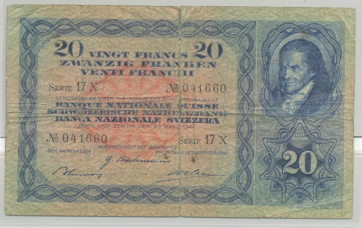 SUISSE 20 FRANCS 23-03-1944 SERIE 17X TB