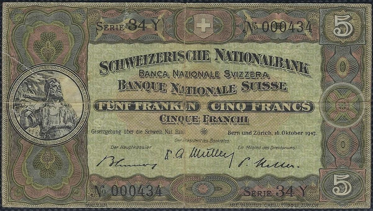 SUISSE 5 FRANCS FRANKEN 16 OCTOBRE 1947 SERIE 34Y TB+