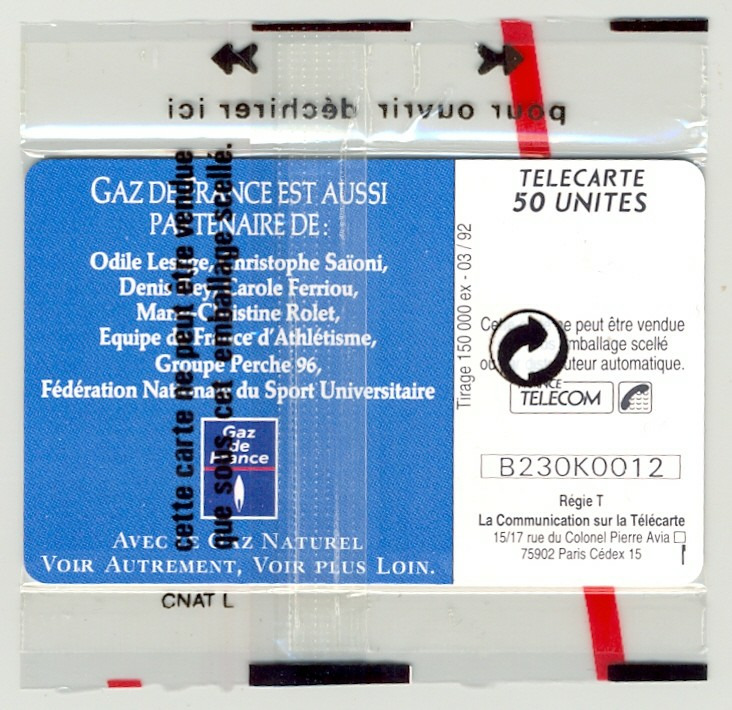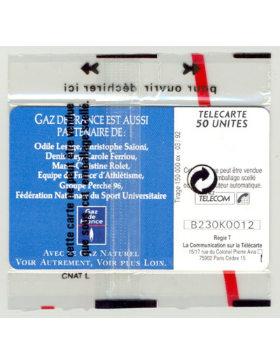TELECARTE NSB 50 UNITES 03/92 GAZ DE FRANCE PARTENAIRE DE NATHALIE TAUZIAT F251