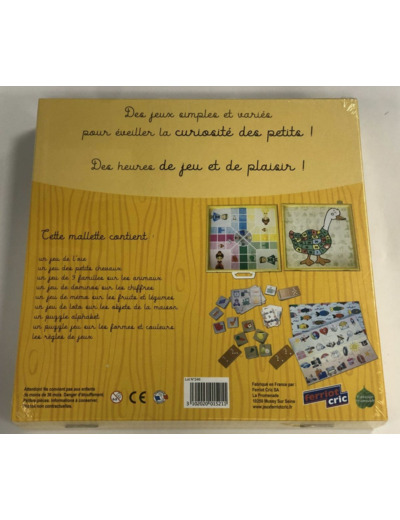 CONTENU : un jeu de l'oie -des petits chevaux - jeu de 9 familles sur les animaux -un jeu de dominos sur les chiffres -1 jeu de memo sur les fruits et légumes -un jeu de loto sur les objets de la maison - un puzzle alphabet - un puzzle jeu sur les formes et les couleurs -les règles de jeux