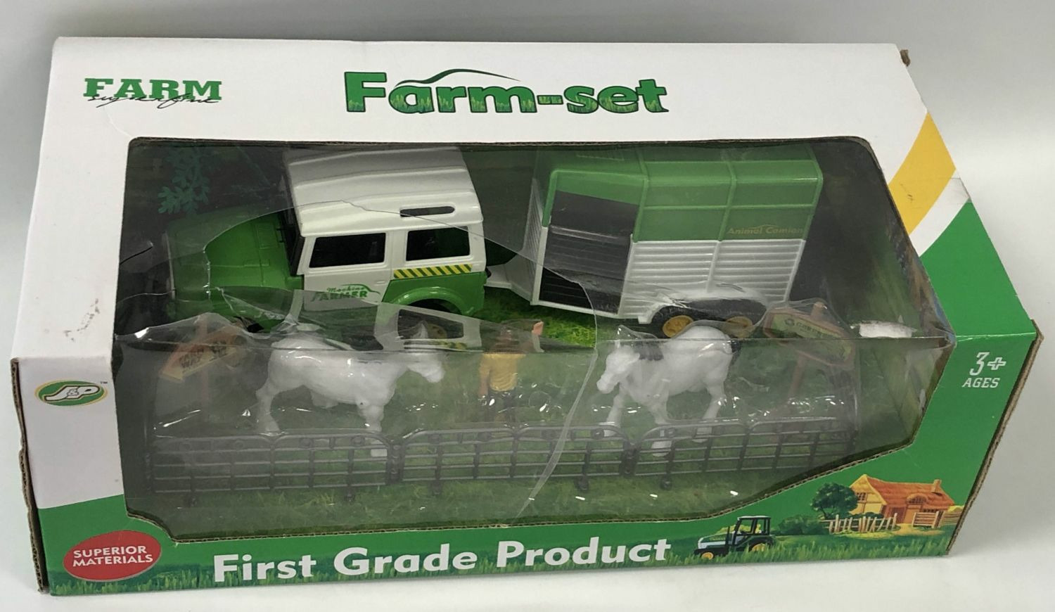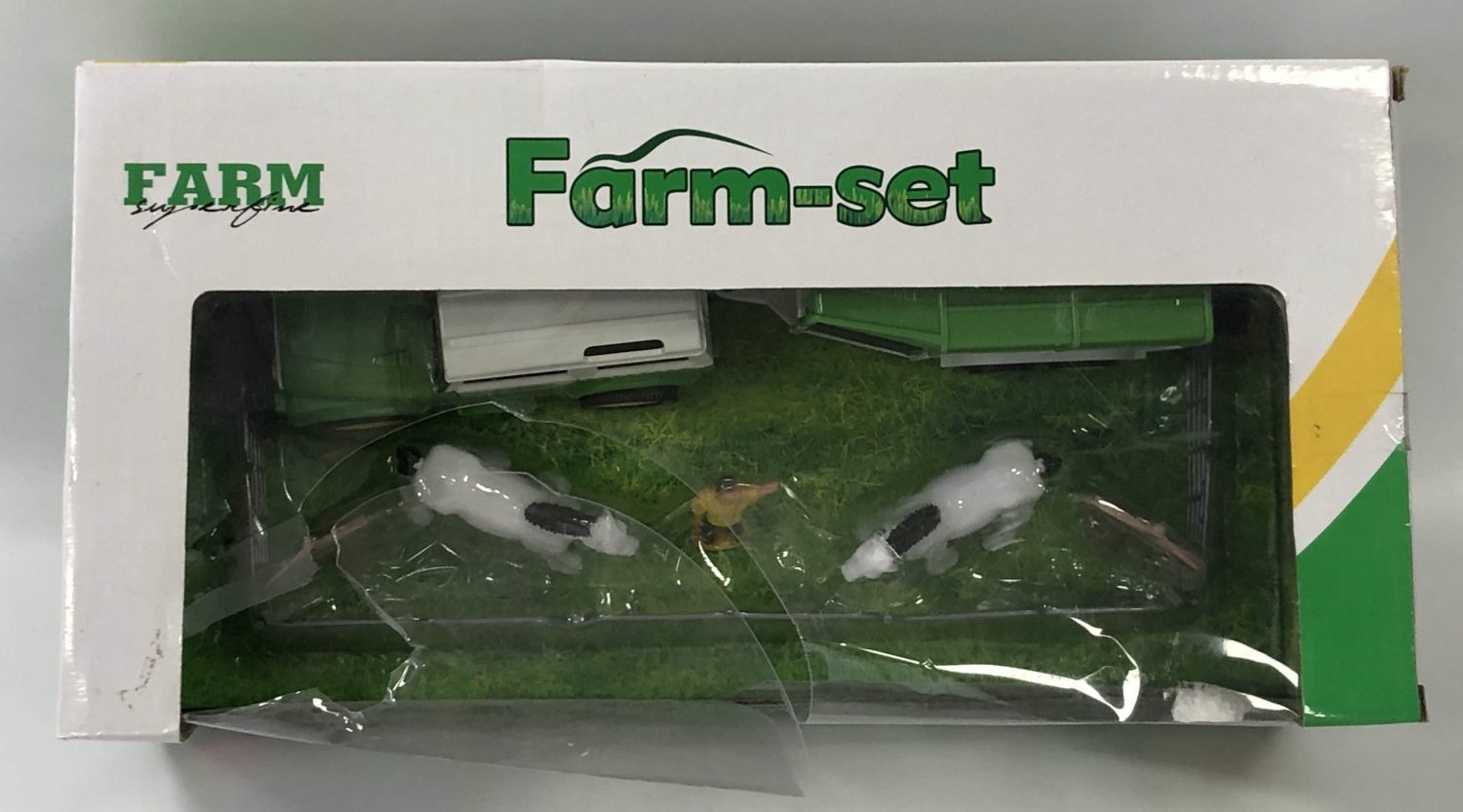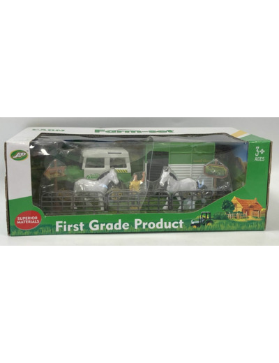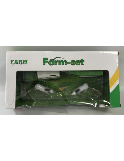 SET DE FERME COMPOSE DE 7 PIECES AVEC TRACTEUR REMORQUE ET ANIMAUX BOITE ABIMEE