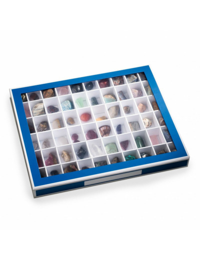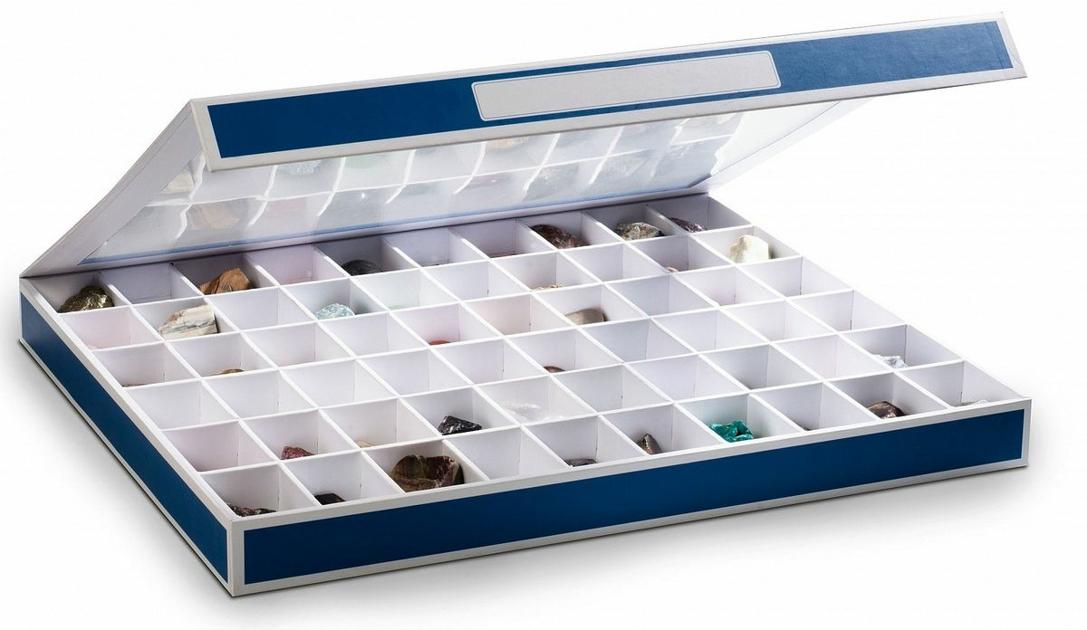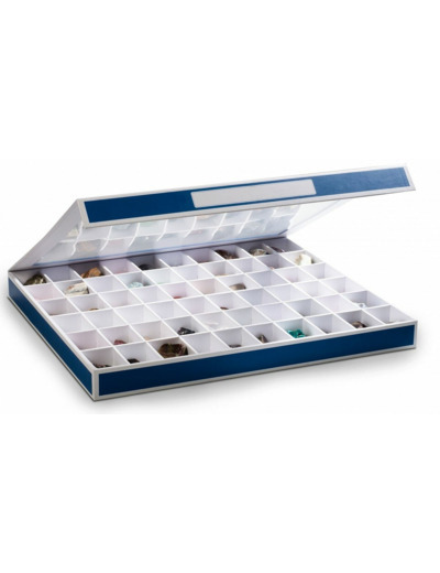 Boîte de couleur bleu en carton solide avec des séparations fixes soit 60 compartiments au format 50 x 36 x 33 mm.