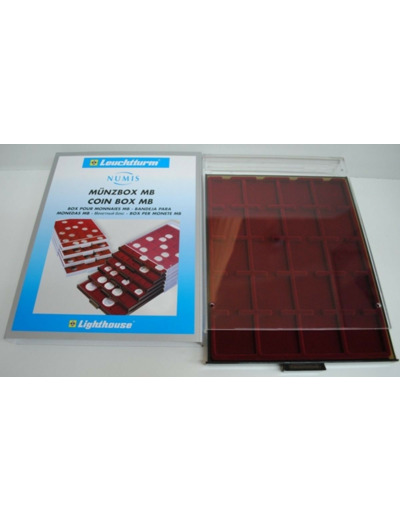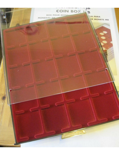 Tiroir teinte fumée, fond bordeaux avec 20 cases carrées pour capsules QUADRUM, étuis carton 50 x 50 mm ou monnaies jusqu'à 50 mm.