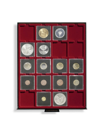 Capsules carrées en plastique résistant aux rayures. Faciles à ouvrir et à fermer. Capsules livrées avec une insertion en mousse noire flexible pour toutes les monnaies courantes jusqu'au diamètre de 18 mm. Pour ranger vos monnaies sous capsules QUADRUM, nous vous recommandons les accessoires LEUCHTTURM pour le classement des étuis carton (coffrets, écrins, médailliers, plateaux). Grâce aux dimensions extérieures identiques, il est possible de loger des monnaies de diamètres différents dans un seul et même système.