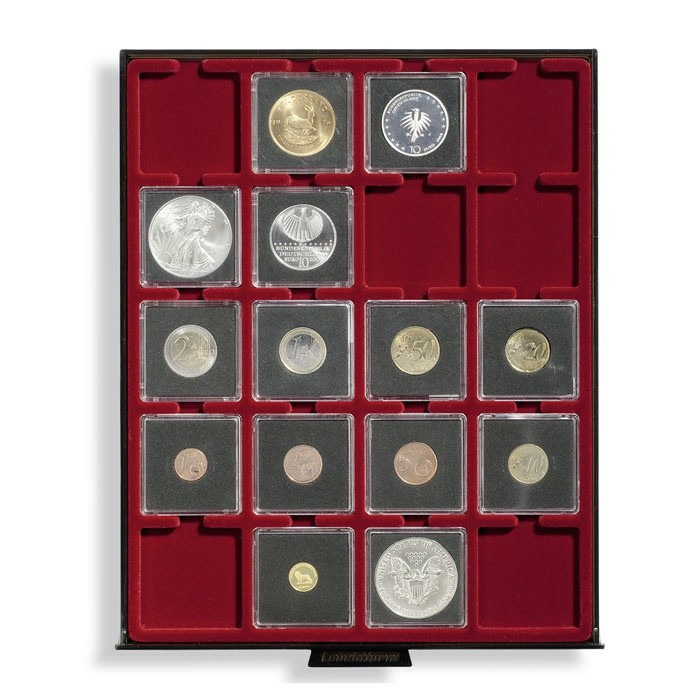 Capsules rectangulaires en plastique de haute qualité et résistant aux rayures. Le couvercle est très facile à saisir et à ouvrir. Les capsules sont livrées avec une insertion noire qui permet de loger les pièces ayant un diamètre de 41 mm. Pour le classement des capsules rectangulaires, nous vous conseillons les accessoires LEUCHTTURM: médailliers, plateaux, écrins et coffrets. Avantage: Les capsules Quadrum ayant toutes les mêmes dimensions extérieures, vous pouvez classer les pièces de tailles très variées dans un même système.
