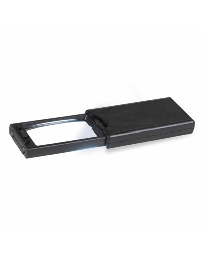 Loupe de poche extractible LED avec grossissement x 2,5 (lentille grande) et grossissement x 45 (lentille petite).