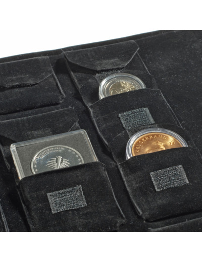 Rouleau en textile de qualité façon velours avec 2 rubans de fermeture. Permet de ranger 24 pièces d'un diamètre de 50 mm au maximum, des capsules QUADRUM ou des étuis carton, pour les mettre au coffre-fort ou dans un sac.