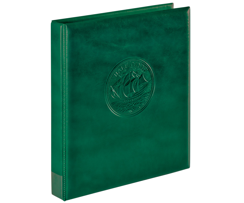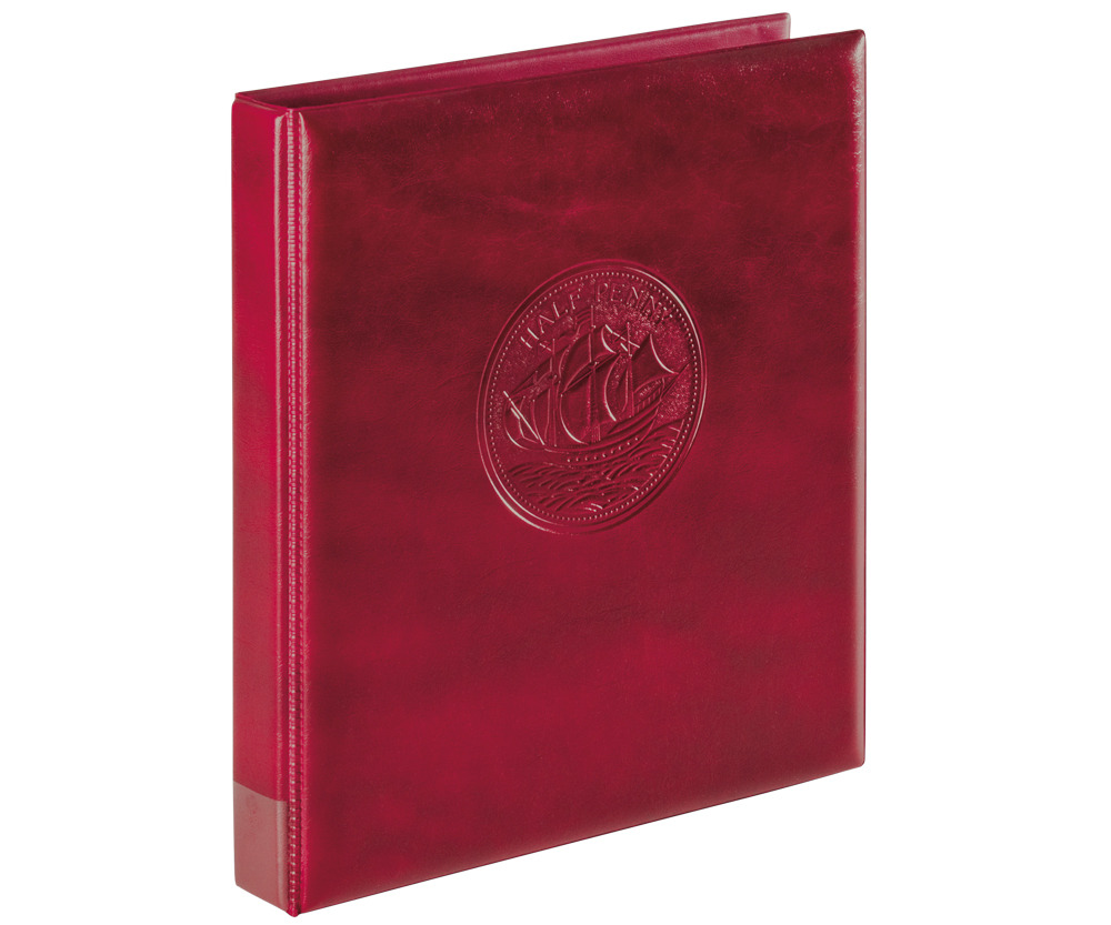 Reliure en PVC synthétique ouatiné avec marquage en relief d'une caravelle sur le couvercle et mécanisme à 4 anneaux. Equipée d'un assortiment de 10 feuilles numismatiques UNIVERSAL (2 x MU15R, 2 x MU24R, 2 x MU35R, 2 x MU40R, 2 x MU54R) et de 10 intercalaires rouge.