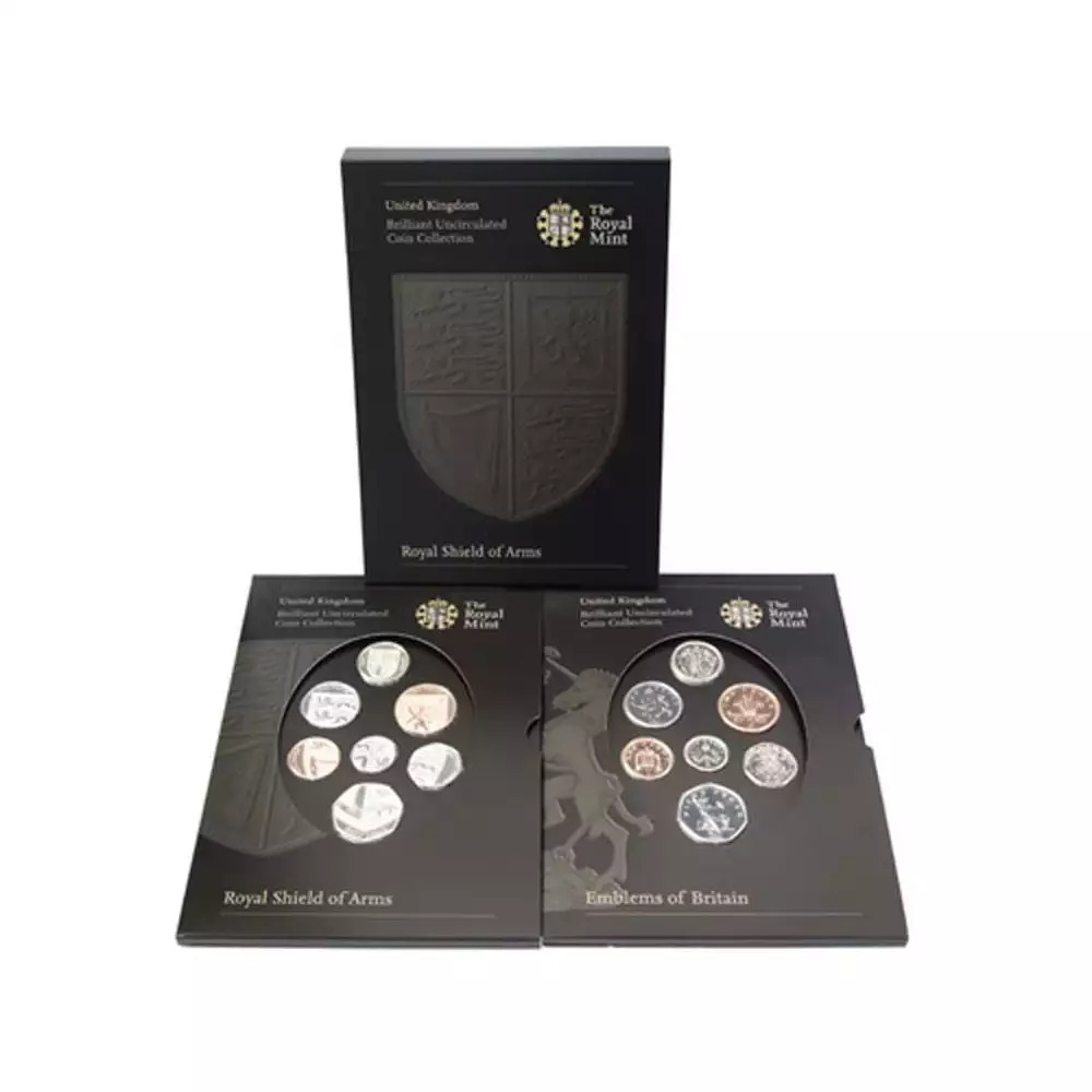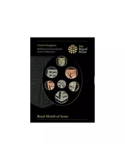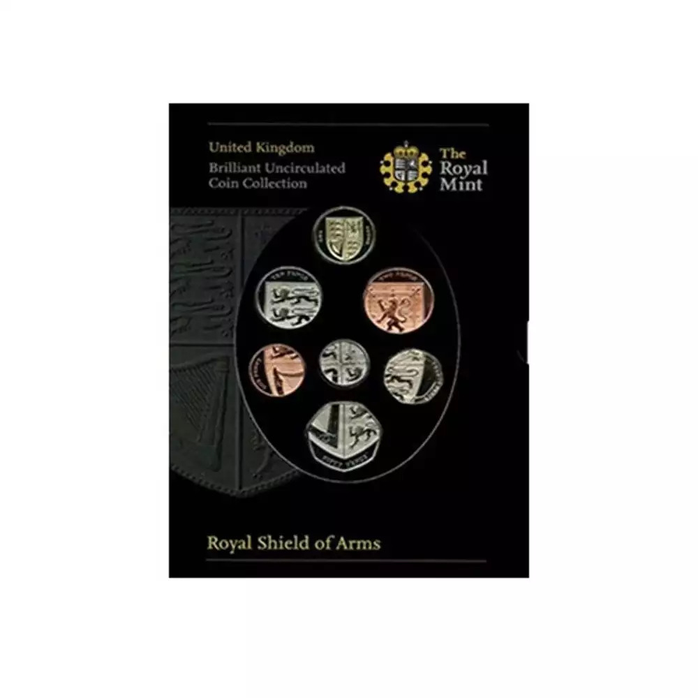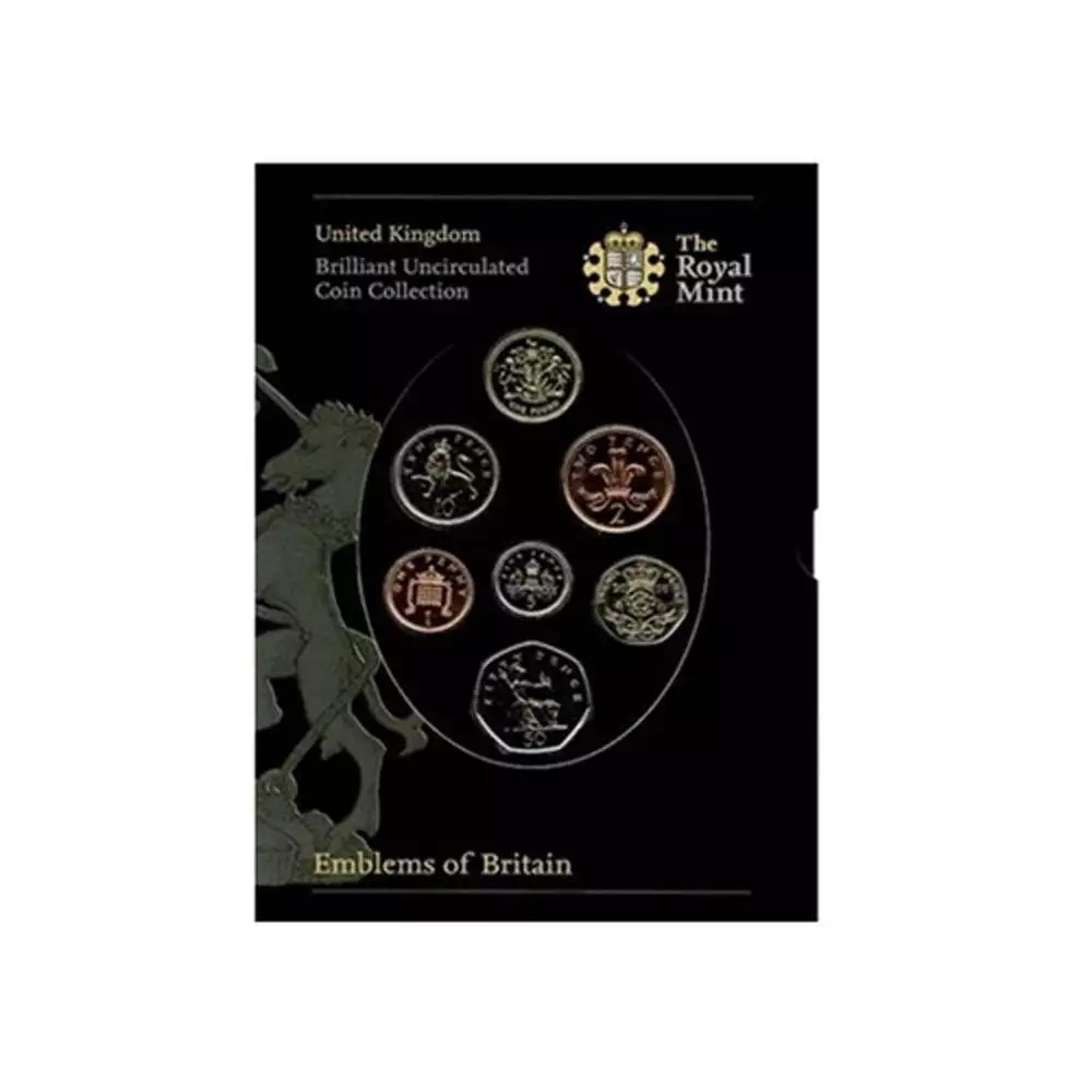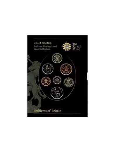Ce coffret brillant universel Royaume Uni 2008, contient deux séries de 7 monnaies de circulation courantes : 1 Penny, 2, 5, 10, 20 et 50 Pence, 1 Pound pour la série traditionnelle Emblems of Britain et la nouvelle série Shield of Armes