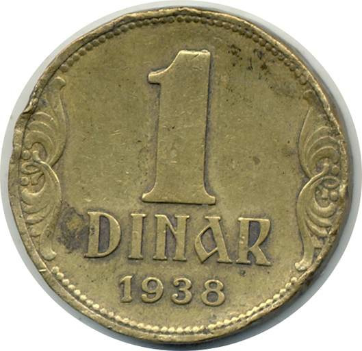YOUGOSLAVIE 1 DINAR 1938 TB+ COUP (W19)