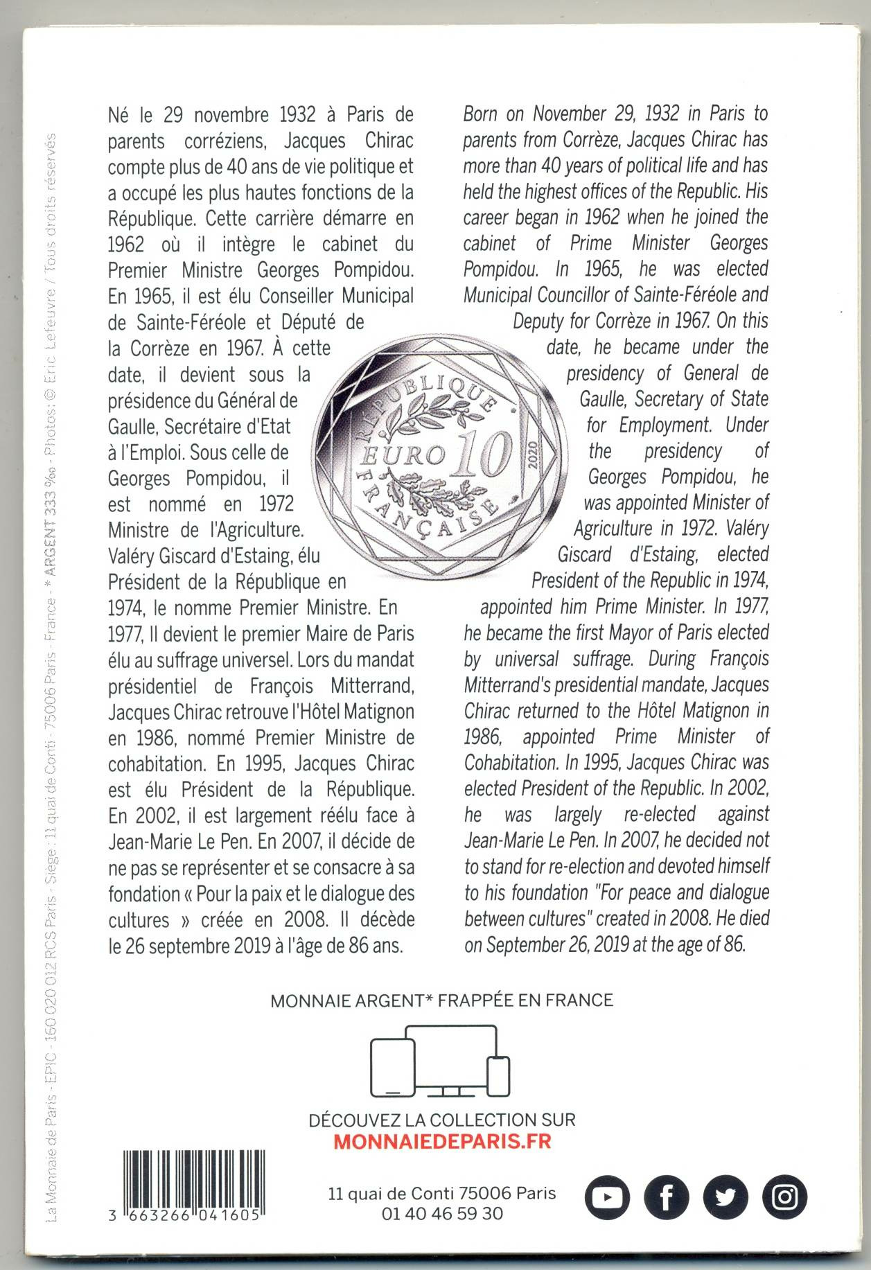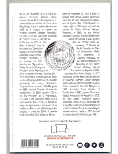 FRANCE 2019 10 EURO JACQUES CHIRAC B.U (sans plastique d'origine )
