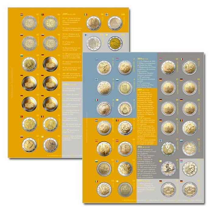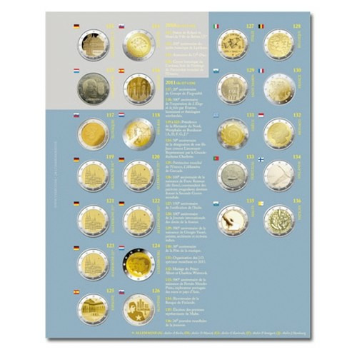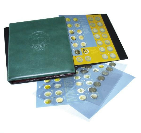 Livré avec les 31 feuilles représentant les versos des pièces de 2 euro chaque pays avec noms, drapeaux, millésimes (28 monnaies par pages) et 31 feuilles transparentes avec bandes coulissantes en PVC neutre (sans acide ni plastifiant)