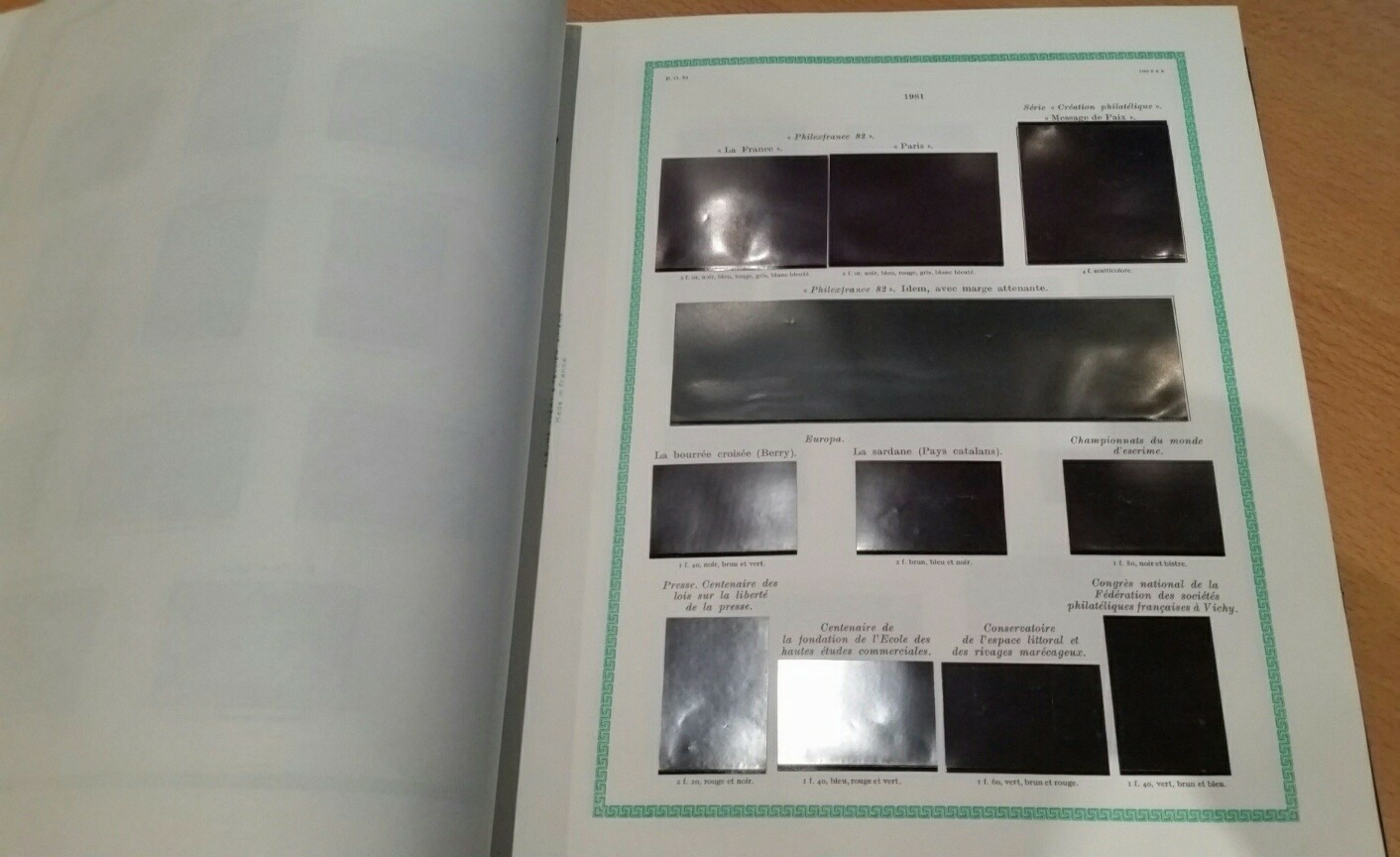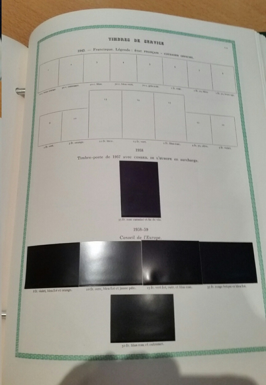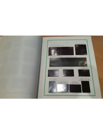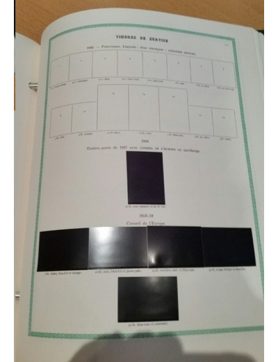 Liseré vert, sans reproduction des timbres : Ces pages d'albums comportent uniquement la numérotation Yvert et Tellier, la valeur faciale et la couleur des timbres.