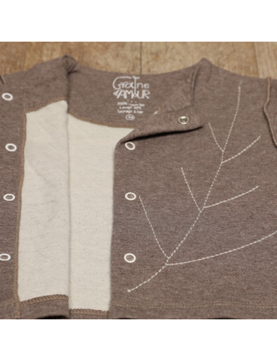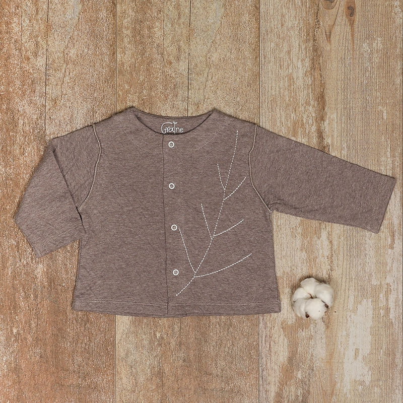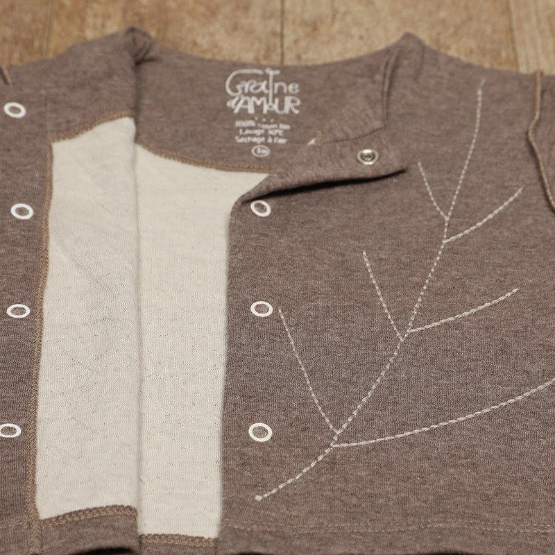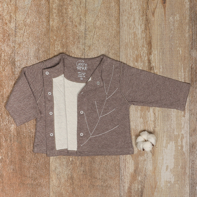 Ce double jersey est une matière en 100% coton bio, l'extérieur en marron chiné et l'intérieur en écru. Cette double épaisseur apportera toute la chaleur nécessaire au bébé. Cette brassière bio est unisexe.