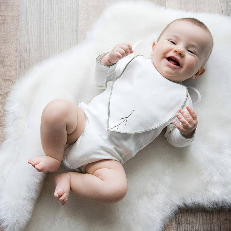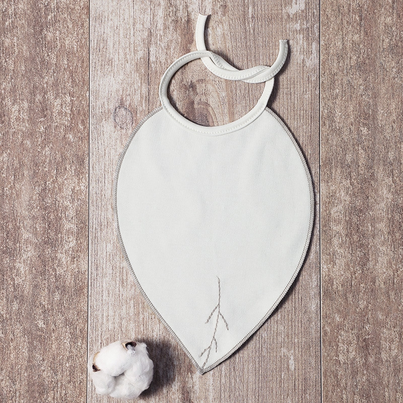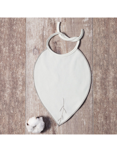 Le bavoir en 100% coton bio est en forme de feuille, il est brodé sur 1 face et sérigraphié sur l'autre face. Il se noue autour de son cou.