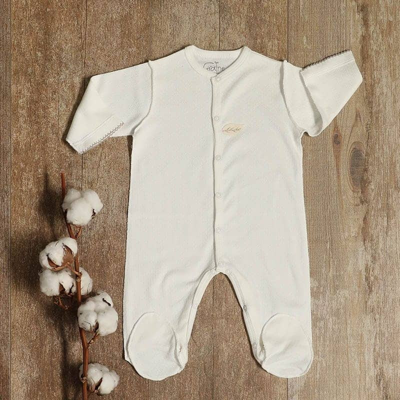 Le pyjama en maille ajourée bio est conçu pour le bien-être de bébé : toutes les coutures sont à l’extérieur, il n’y a aucune étiquette et la sérigraphie est réalisée sans métaux lourds.