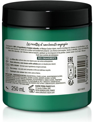 Les recettes d’une beauté engagée Collections Nature s’inspire de la nature pour élaborer des recettes de beauté capillaires plus naturelles, Vegan et fabriquées en France. Composé à 96% d'ingrédients d'origine naturelle, ce Masque Couleur répare, nourrit et protège les cheveux en profondeur. Les écailles sont lissées et l’éclat de la couleur est durablement préservé. Les cheveux sont souples, faciles à démêler, doux et brillants sans être alourdis. NOS ENGAGEMENTS : -La Mûre Bio cultivée dans nos régions pour ses vertus antioxydantes -Sans silicones et sans tensio-actifs sulfatés pour un résultat plus naturel -100% VEGAN : formule sans ingrédients d'origine animale -Eco-conçu : nos pots sont composés à 50% de matériaux recyclés -Fabriqué avec amour dans notre usine à Reims Collections Nature, ce sont mes recettes pour mieux vivre, être bien dans ma vie et bien sur ma planète.