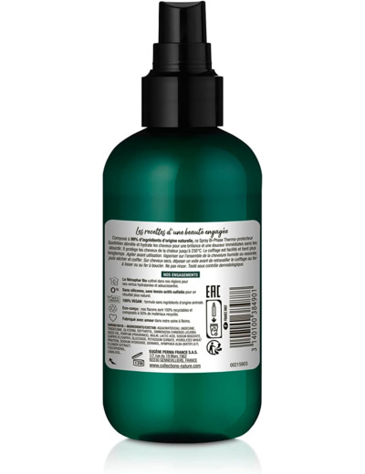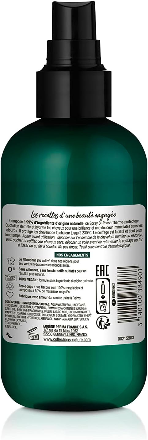 Les recettes d’une beauté engagéeCollections Nature s’inspire de la nature pour élaborer des recettes de beauté capillaires plus naturelles, Vegan et fabriquées en France posé à 99% d’ingrédients d’origine naturelle, ce Spray Bi-Phase Thermo-protecteur Quotidien démêle et hydrate les cheveux pour une brillance et une douceur immédiate sans les alourdir. Il protège les cheveux de la chaleur jusqu’à 230 C. Le coiffage est facilité et tient plusENGAGEMENTS: -Le Nénuphar Bio cultivé dans nos régions pour ses vertus hydratantes et adoucissantes-Sans silicones et tensio-actifs sulfatés pour un résultat plus naturel-100% VEGAN: formule sans ingrédients d'origine animale -Eco-conçu: nos flacons sont 100% recyclables et composés à 50% de matériaux recyclés-Fabriqué avec amour dans notre usine à ReimsCollections Nature, ce sont mes recettes pour mieux vivre, être bien dans ma vie et bien sur ma planète. MODE D'EMPLOI Vaporisez sur les cheveux avant de les coiffer à chaud pour les protéger contre les dommages causés