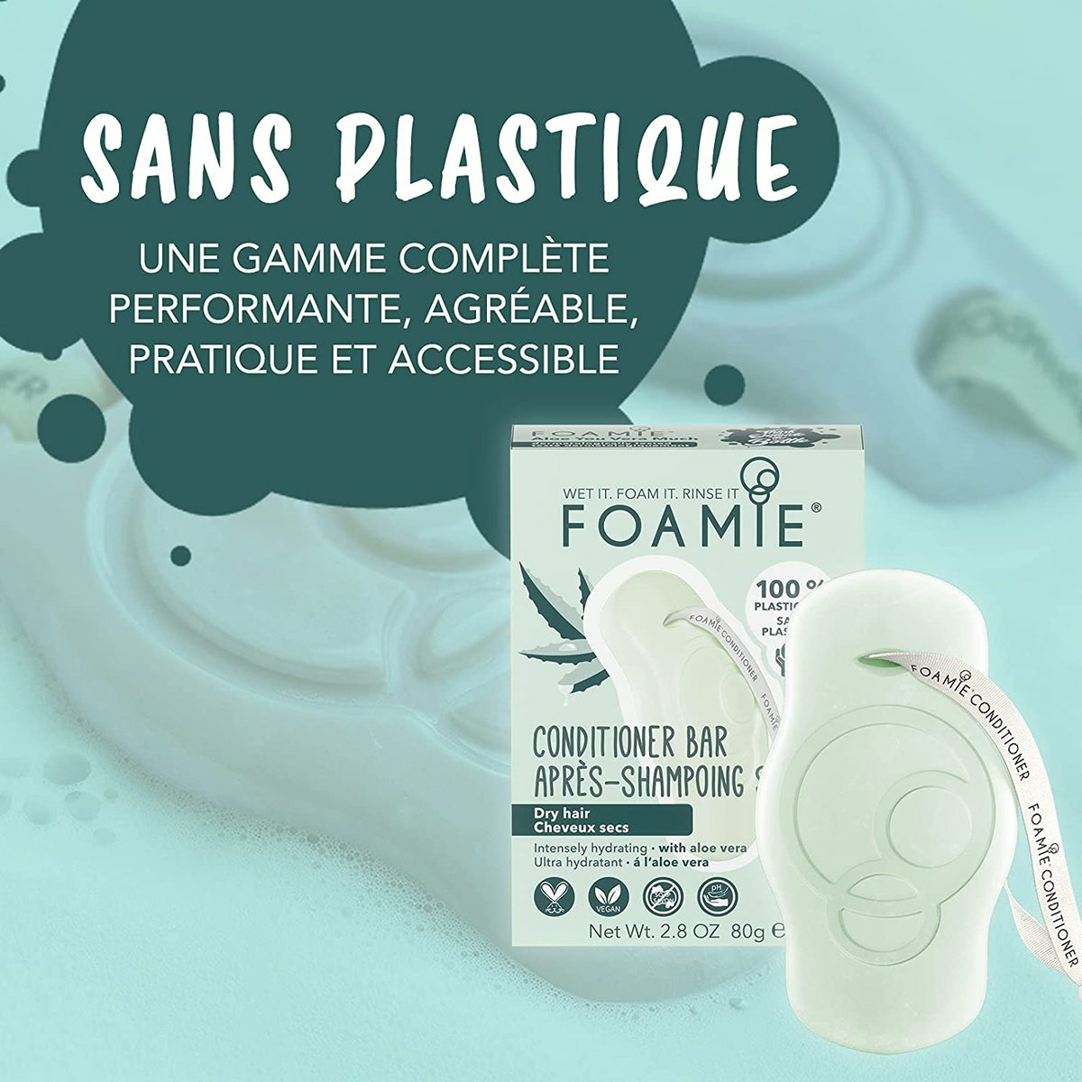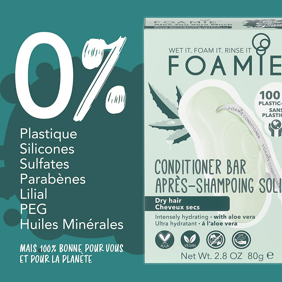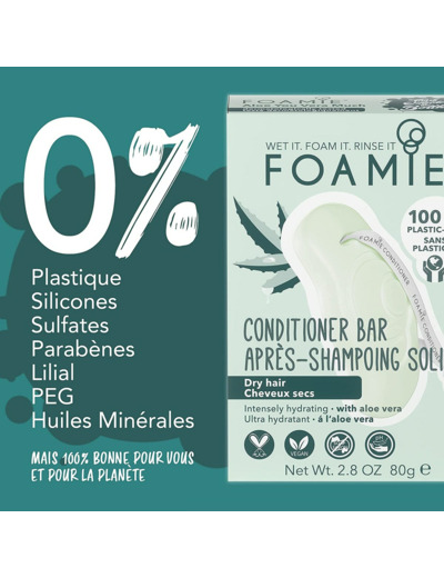 Notre après-shampoing solide procure et maintient une hydratation intense. Grâce à notre formule vos cheveux garderont toute la journée le parfum rafraîchissant de l'aloe vera ! Nos après shampoings solides Foamie soignent efficacement les cheveux à long terme grâce à notre formule optimisée (pH 5,5) qui rééquilibre les cheveux en l'hydratant en profondeur et qui referme soigneusement les cuticules (la couche supérieure du cheveu). Notre promesse : 0% plastique. 0% PEG. 0% d'huiles minérales. 0% silicone. 0% lilial et 0% savon. En n'utilisant pas de plastique, Foamie est plus respectueux de l'environnement que les gels douche classiques dans des bouteilles en plastique. Vous économisez environ 2 bouteilles en plastique avec chaque produit Foamie et vous contribuerez à la préservation de l'environnement. En collaboration avec l'organisation " The Ocean Cleanup, nous collectons les déchets plastiques et vous pouvez nous aider dès maintenant. Pour chaque mousse que nous vendons, nous gardons les mers un peu plus propres.