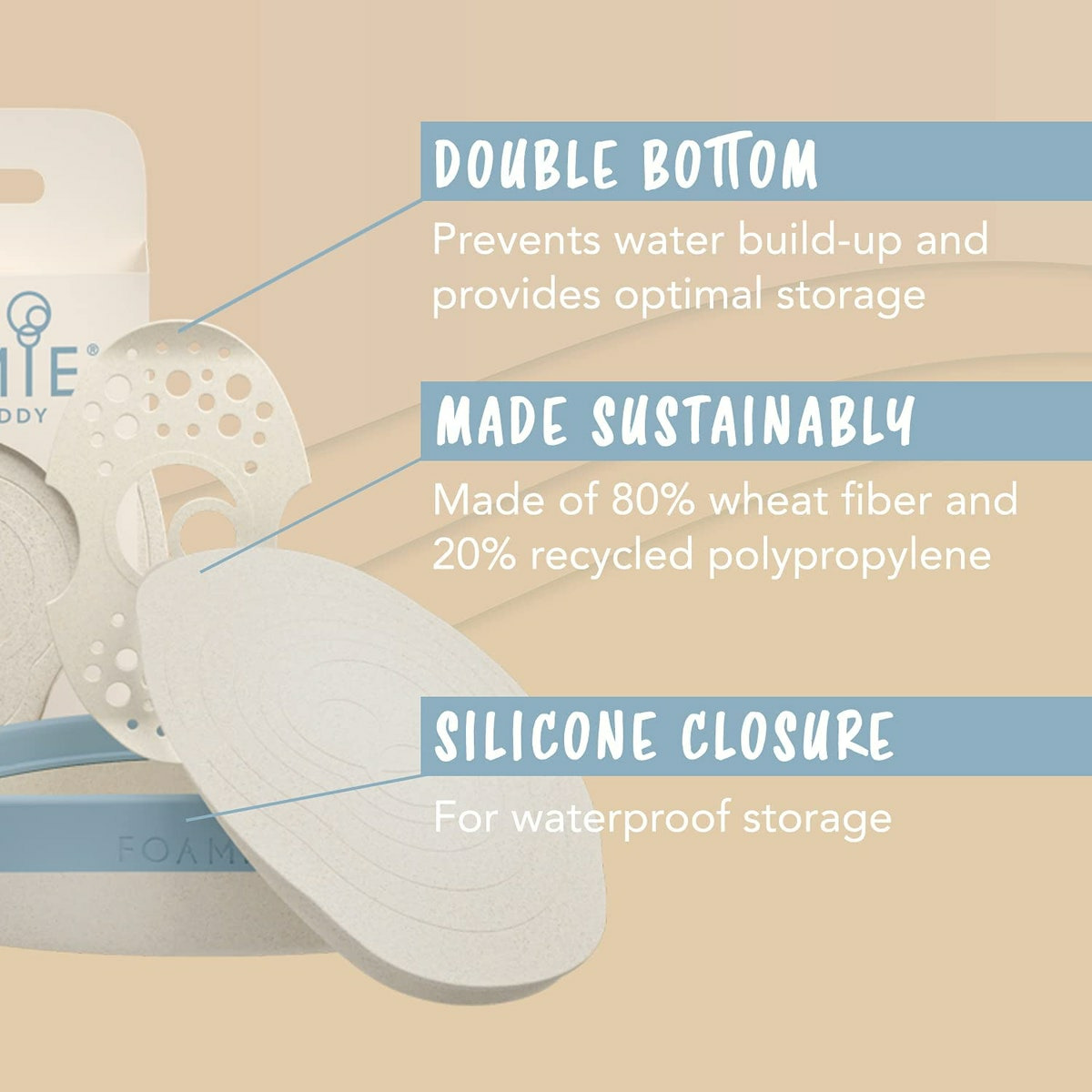 "Vous n'avez pas de place pour accrocher vos shampoings solides et après-shampoings solides FOAMIE préférés, mais vous souhaitez les emmener avec vous en voyage ? Découvrez notre Travel Buddy ! Notre boîte de voyage innovante Travel Buddy a été conçu de manière fonctionnelle avec une partie amovible pour séparer vos soins solides de l'eau résiduelle, prolongeant ainsi la durée de vie de votre soin solide FOAMIE si vous ne pouvez pas la suspendre pour la faire sécher. Le joint étanche évite tout déversement durant votre voyage. Et si vous ne voyagez pas, vous pouvez toujours l'utiliser comme une boîte à savon ;) Le couvercle est doté d'un joint en silicone qui est 100 % étanche, et l'ensemble du produit est fabriqué à partir de 80 % de paille de blé et de 20 % de matériaux recyclés."
