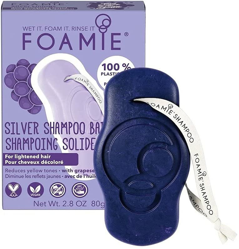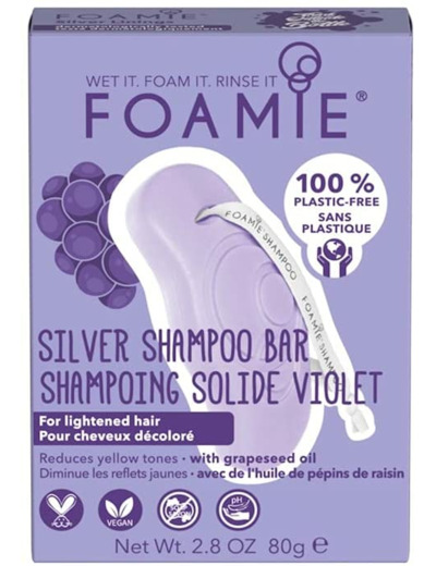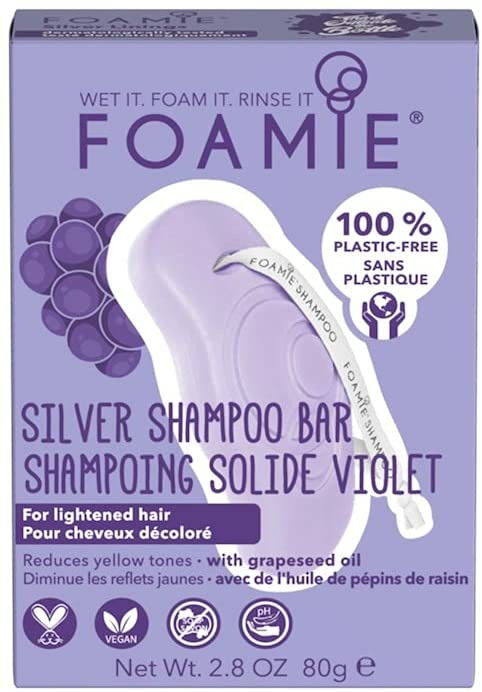 Notre shampoing violet Foamie Silver Linings à l'huile de pépins de raisin est un shampoing solide qui diminue les reflets jaunes. Le shampoing solide Foamie Silver Linings est particulièrement adapté pour réduire les tons jaunes des cheveux éclaircis ou décolorés. Les pigments de couleur violets neutralisent les tons cuivrés pour révéler une nuance de blond fraîche et naturelle. Grâce à l'huile de pépins de raisin, ce shampoing solide aidera vos cheveux à retrouver leur brillance et leur éclat naturel, tout en améliorant leur état général ! Nos shampoings solides Foamie soignent efficacement les cheveux à long terme grâce à notre formule optimisée (pH (5,5) qui rééquilibre les cheveux en l'hydratant en profondeur et qui referme soigneusement les cuticules (la couche supérieure du cheveu). Notre promesse : 0% plastique. 0% PEG. 0% d'huiles minérales. 0% silicone. 0% lilial et 0% savon. En n'utilisant pas de plastique, Foamie est plus respectueux de l'environnement que les gels douche classiques dans des bouteilles en plastique. Vous économisez environ 2 bouteilles en plastique en utilisant un produit Foamie et vous contribuerez à la préservation de l'environnement. En collaboration avec l'organisation " The Ocean Cleanup, nous collectons les déchets plastiques et vous pouvez nous aider dès maintenant. Pour chaque soin que nous vendons, nous gardons les océans un peu plus propres.