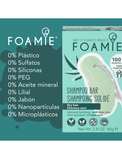 Notre shampoing solide procure et maintient une hydratation intense. Grâce à notre formule vos cheveux garderont toute la journée le parfum rafraîchissant de l'aloe vera ! Nos shampoings solides Foamie soignent efficacement les cheveux à long terme grâce à notre formule optimisée (pH (5,5) qui rééquilibre les cheveux en l'hydratant en profondeur et qui referme soigneusement les cuticules (la couche supérieure du cheveu). Notre promesse : 0% plastique. 0% PEG. 0% d'huiles minérales. 0% silicone. 0% lilial et 0% savon. En n'utilisant pas de plastique, Foamie est plus respectueux de l'environnement que les gels douche classiques dans des bouteilles en plastique. Vous économisez environ 2 bouteilles en plastique en utilisant un produit Foamie et vous contribuerez à la préservation de l'environnement. En collaboration avec l'organisation " The Ocean Cleanup, nous collectons les déchets plastiques et vous pouvez nous aider dès maintenant. Pour chaque soin que nous vendons, nous gardons les océans un peu plus propres.
