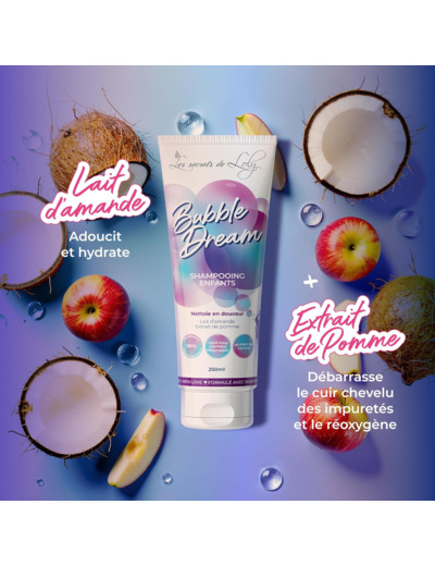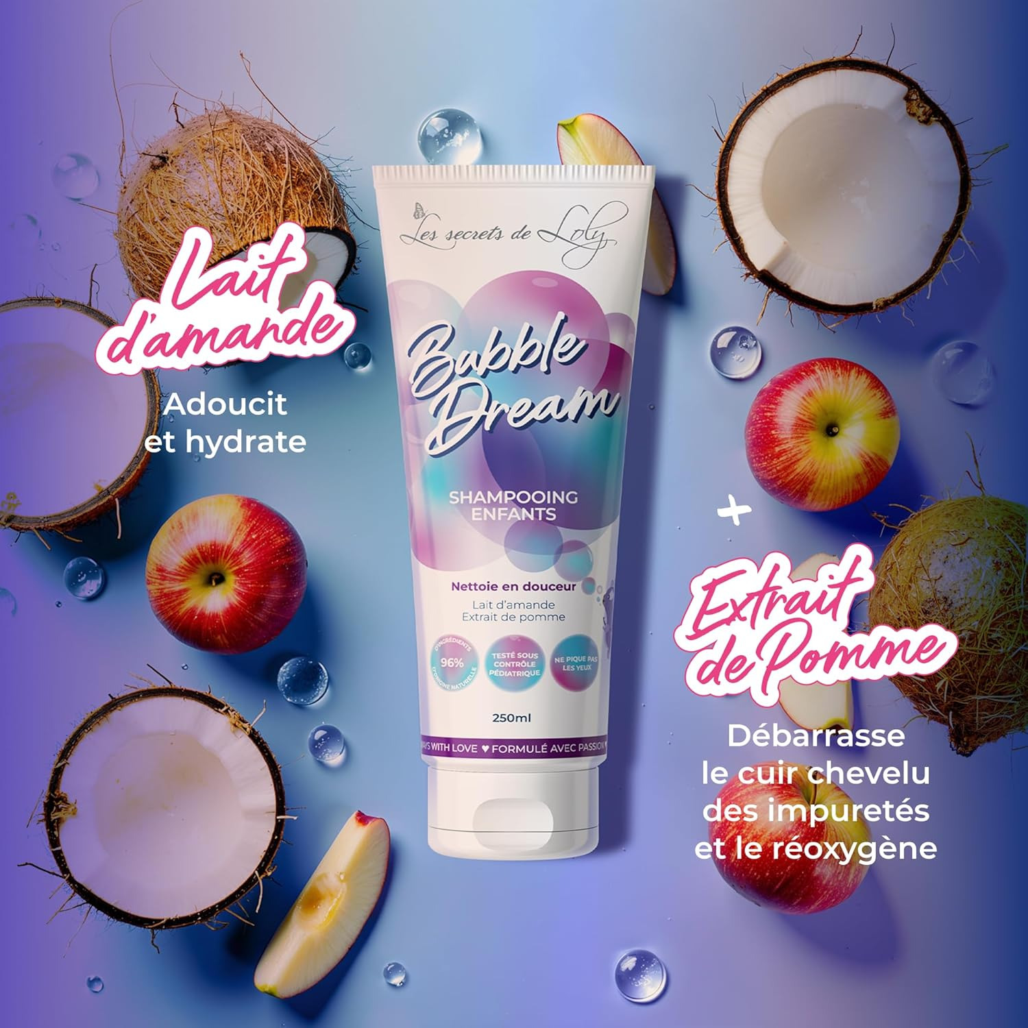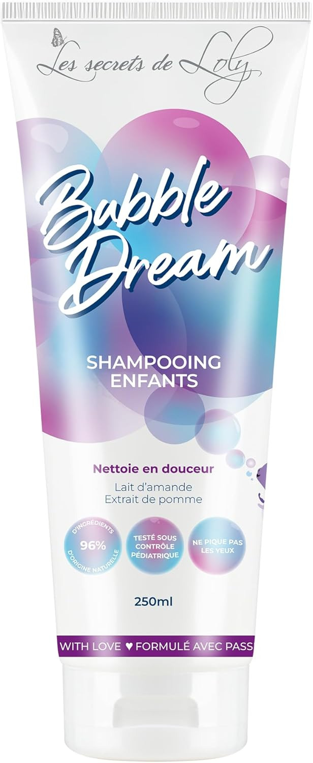 Offrez à votre enfant un moment de soin tout en douceur avec le shampooing Bubble Dream 250ml Les Secrets de Loly. Spécialement formulé pour les cheveux bouclés, frisés ou crépus dès 3 ans, ce shampooing sans sulfate, sans silicone, il nettoie en douceur tout en respectant le cuir chevelu sensible des plus petits. Grâce à sa composition à 96% d’ingrédients d’origine naturelle, enrichie en protéines d’amande douce, extrait de pomme et agents hydratants, il redéfinit et assouplit les boucles tout en les laissant brillantes et faciles àshampooing ne pique pas les yeux et est facile à rincer. Avec sa mousse onctueuse, facile à appliquer, vous transformez le bain en un moment agréable. Apprécié des enfants comme des parents, notre shampooing est la solution idéale. Testé sous contrôle pédiatrique, il garantit la tolérance pour le cuir chevelu et ne pique pas les yeux. Ce shampooing doux est également végan, formulé sans ingrédient controversé, pour prendre soin des cheveux de vos enfants tout en douceur et en toute: appliquez quelques noisettes sur cheveux mouillés, massez le cuir chevelu puis rincez à l’eau tiède.COMPOSITION : AQUA, GLYCERIN, COCAMIDOPROPYL BETAINE, DISODIUM COCOYL GLUTAMATE, BETAINE, GUAR HYDROXYPROPYLTRIMONIUM CHLORIDE, PARFUM, SODIUM COCOYL GLUTAMATE, SODIUM COCOYL APPLE AMINO ACIDS, LEVULINIC ACID, SODIUM BENZOATE, XANTHAN GUM, HYDROLYZED SWEET ALMOND PROTEIN, SODIUM LEVULINATE, BUTYLENE GLYCOL, PRUNUS AMYGDALUS DULCIS OIL, CITRIC ACID, PYRUS MALUS FRUIT EXTRACT, LYSOLECITHIN, SODIUM HYDROXIDE, TETRASODIUM GLUTAMATE DIACETATE, POTASSIUM SORBATE, MICA, TITANIUM DIOXIDE (CI 77891) INGRÉDIENTS AQUA, GLYCERIN, COCAMIDOPROPYL BETAINE, SODIUM COCOYL APPLE AMINO ACIDS, BETAINE, GUAR HYDROXYPROPYLTRIMONIUM CHLORIDE, PARFUM, HEXYLENE GLYCOL, BENZYL ALCOHOL*, HYDROLYZED SWEET ALMOND SEEDCAKE, TETRASODIUM GLUTAMATE DIACETATE, DEHYDROACETIC ACID*, SODIUM HYDROXIDE, SODIUM BENZOATE, MICA, CI77891. *Conservateurs certifiés Écocert MODE D'EMPLOI Appliquez le shampooing sur cheveux mouillés en insistant bien sur le cuir chevelu tout en effectuant des mouvements circulaires et laissez la mousse onctueuse descendre sur les longueurs. N’hésitez pas à sectionner les cheveux afin de nettoyer plus facilement le cuir chevelu. Pour une routine de lavage complète/optimale, appliquez l’après-shampooing Pink Paradise à la suite. AVERTISSEMENT DE SÛRETÉ Appliquez le shampooing sur cheveux mouillés en insistant bien sur le cuir chevelu tout en effectuant des mouvements circulaires et laissez la mousse onctueuse descendre sur les longueurs. N’hésitez pas à sectionner les cheveux afin de nettoyer plus facilement le cuir chevelu. Pour une routine de lavage complète/optimale, appliquez l’après-shampooing Pink Paradise à la suite.