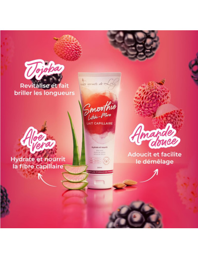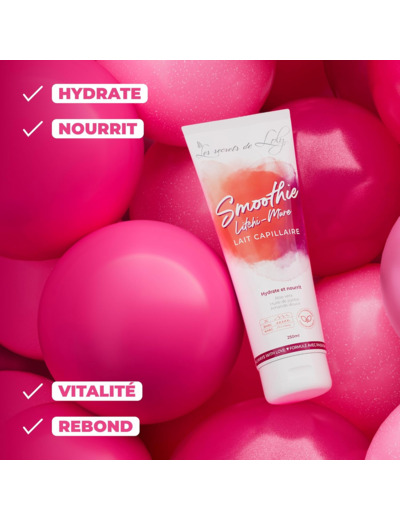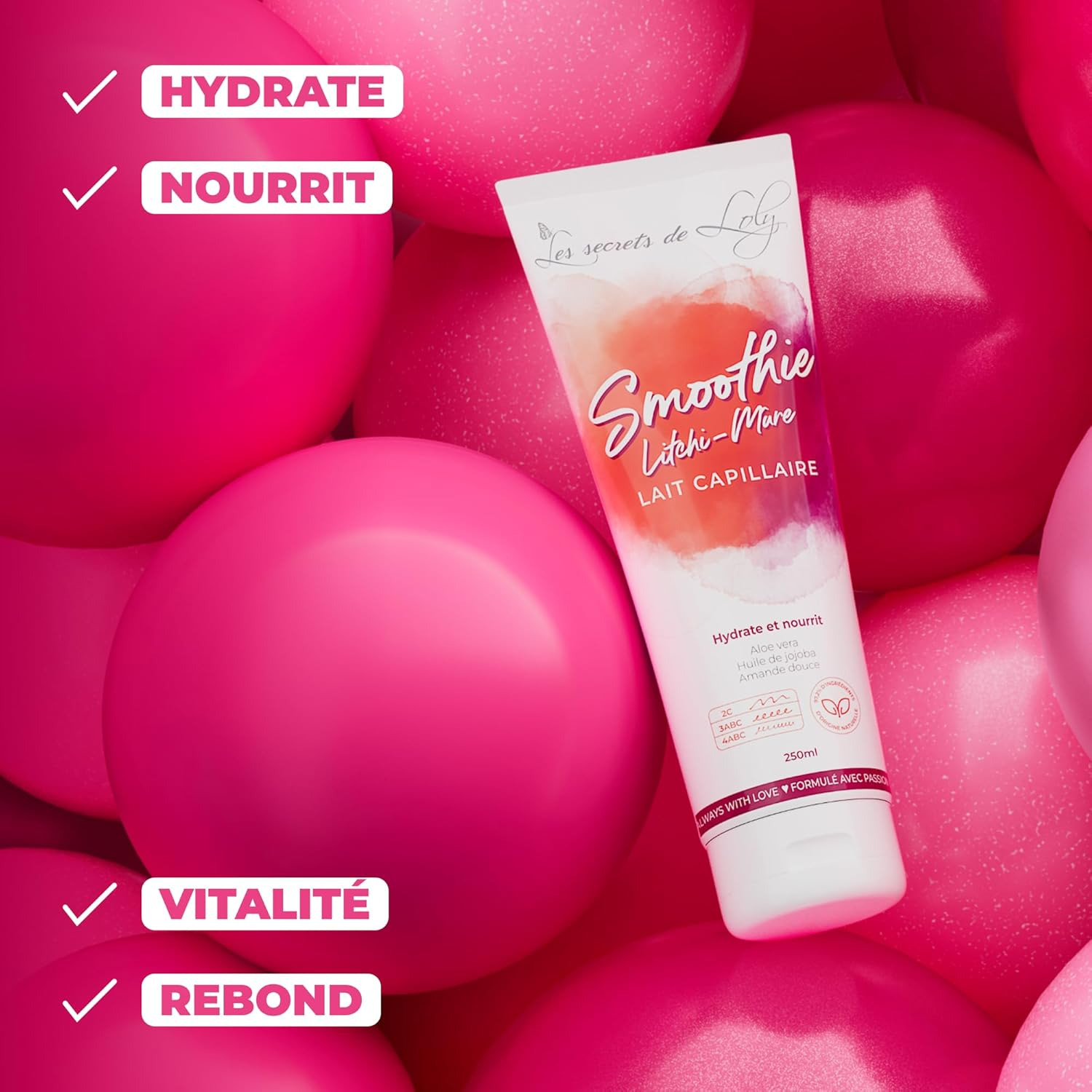 Le Smoothie Litchi-mûre de Secrets de Loly est un lait capillaire hydratant nourrissant, spécialement formulé pour répondre aux besoins des cheveux secs, frisés et crépus. Composé à 99,2 % d’ingrédients d’origine naturelle, il associe des actifs puissants, comme l'aloe vera pour l'hydratation, protéine de jojoba pour réhydrater et fortifier les longueurs, provitamine B5 pour réparer et fortifier. Il aide à limiter la casse et à définir les boucles. Utilisé quotidiennement, notre lait redonne vie aux cheveux secs, cassants ousoin quotidien à appliquer après un shampooing hydratant répare la fibre capillaire, limite la casse, facilite le coiffage et sublime les boucles. UTILISATION : à utiliser aussi bien sur cheveux secs qu’humides. En complément d’un après-shampooing, il complète parfaitement une routine capillaire naturelle. Son parfum fruité et sa texture crémeuse offrent un moment de bien-être durant votre routine beauté.. Son parfum fruité de litchi-mûre offre une senteur rafraîchissante à vos cheveux qui vous accompagnera tout au long de la journée. UTILISATION : appliquez une noisette quotidiennement sur cheveux secs ou humides. Si vous avez les cheveux frisés et que vous souhaitez définir vos boucles juste après, appliquez notre leave-in sur cheveux humides puis ajouter la gelée Boost Curl. Si vous avez les cheveux crépus vous pour utiliser la crème Magic Twist après. COMPOSITION : AQUA, PRUNUS AMYGDALUS DULCIS OIL,SIMMONDSIA CHINENSIS SEED OIL, CAPRYLIC/CAPRICTRIGLYCERIDE, CETEARYL ALCOHOL, MANGIFERA INDICA SEEDBUTTER, PARFUM, PANTHENOL, HYDROLYZED JOJOBA PROTEIN,ALOE BARBADENSIS LEAF JUICE POWDER*,LEUCONOSTOC/RADISH ROOT FERMENT FILTRATE, CETEARYLGLUCOSIDE, CYMBOPOGON FLEXUOSUS OIL*, BENZYL ALCOHOL,DEHYDROACETIC ACID, POTASSIUM SORBATE, SODIUMHYDROXIDE***, HEXYL CINNAMAL**, CITRAL**, GERANIOL**,LIMONENE**, LINALOOL**, CITRONELLOL**.* Issu de l'agriculture biologique** Présent dans le parfum*** Ajusteur de pH INGRÉDIENTS AQUA, PRUNUS AMYGDALUS DULCIS OIL, SIMMONDSIA CHINENSIS SEED OIL, CAPRYLIC/CAPRIC TRIGLYCERIDE, CETEARYL ALCOHOL, MANGIFERA INDICA SEED BUTTER, PARFUM, PANTHENOL, HYDROLYZED JOJOBA PROTEIN, ALOE BARBADENSIS LEAF JUICE POWDER*, LEUCONOSTOC/RADISH ROOT FERMENT FILTRATE, CETEARYL GLUCOSIDE, CYMBOPOGON FLEXUOSUS OIL*, BENZYL ALCOHOL, DEHYDROACETIC ACID, POTASSIUM SORBATE, SODIUM HYDROXIDE***, HEXYL CINNAMAL**, CITRAL**, GERANIOL**, LIMONENE**, LINALOOL**, CITRONELLOL**. * Issu de l'agriculture biologique ** Présent dans le parfum *** Ajusteur de pH MODE D'EMPLOI Appliquez une noisette quotidiennement sur cheveux secs ou humides. Si vous souhaitez définir vos boucles juste après, appliquez-le sur cheveux humides puis ajoutez la gelée Boost Curl. Vous pouvez utiliser le smoothie quotidiennement. AVERTISSEMENT DE SÛRETÉ Appliquez une noisette quotidiennement sur cheveux secs ou humides. Si vous souhaitez définir vos boucles juste après, appliquez-le sur cheveux humides puis ajoutez la gelée Boost Curl. Vous pouvez utiliser le smoothie quotidiennement.