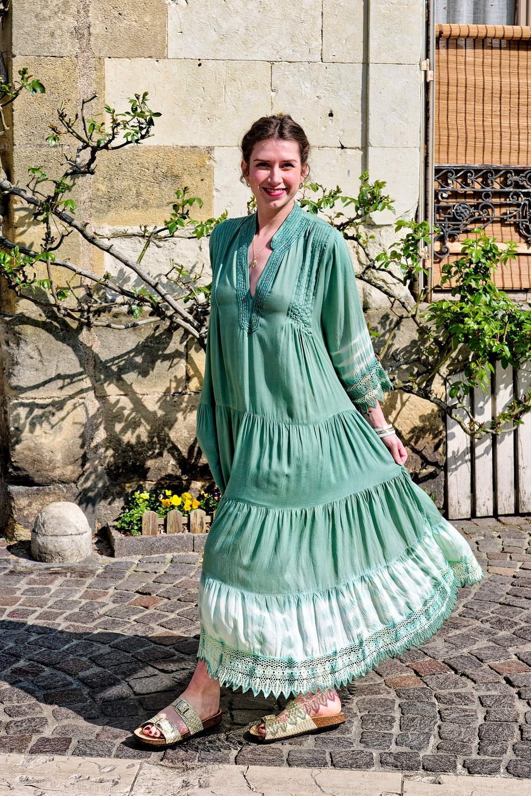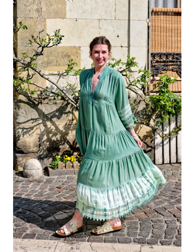 Affichant un style bohème, cette robe est parfaite pour toutes les occasions, que ce soit un dîner décontracté ou une sortie en ville. Son encolure en V ornée de broderies ajoute une touche délicate, tandis que les bas de manches et de la robe en guipure apportent une note de sophistication à votre silhouette.