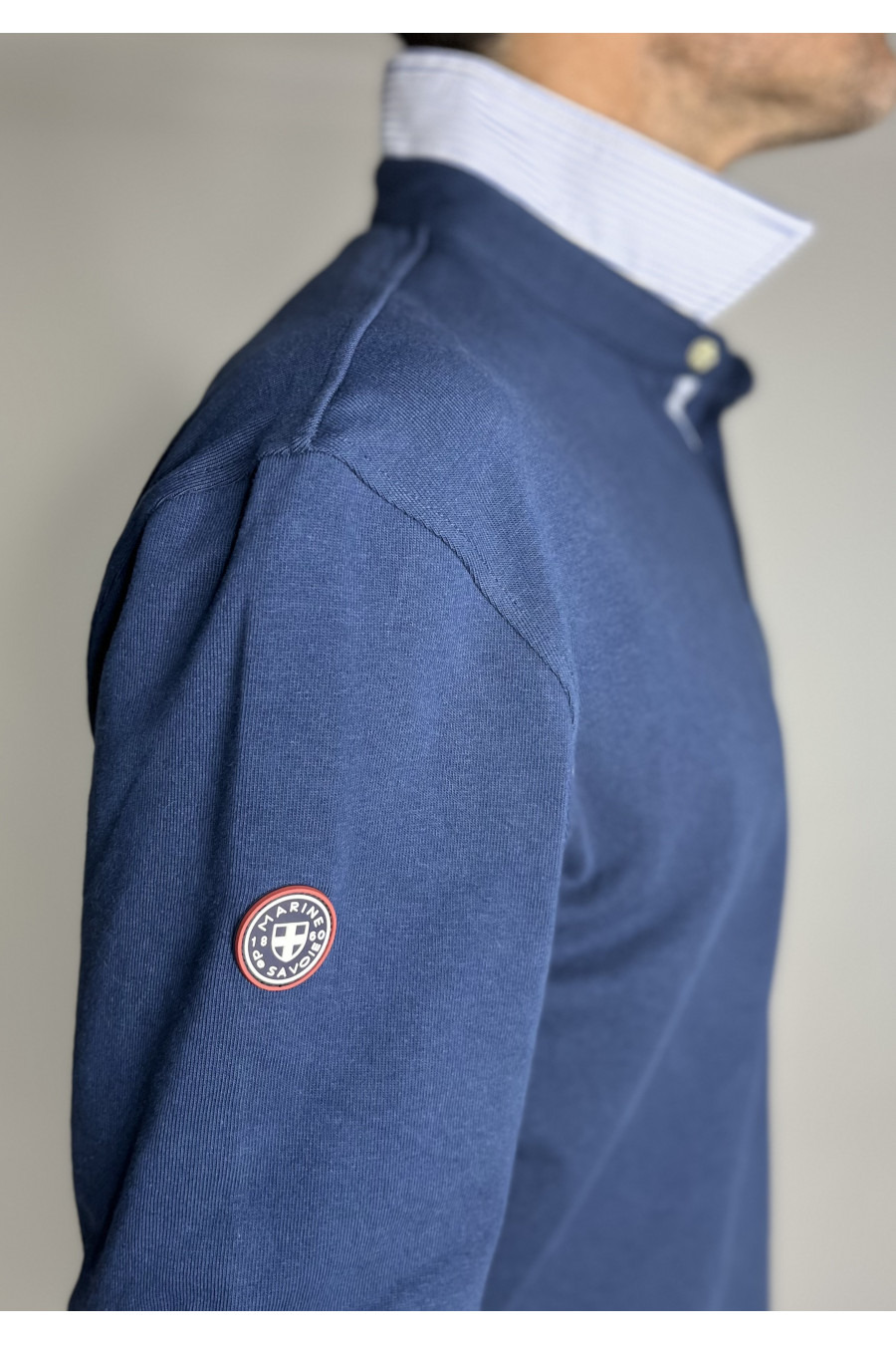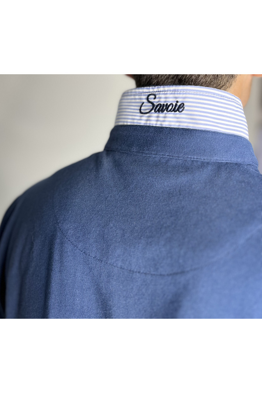 Les détails raffinés, tels que le tissu contrasté aux poignets et au col, ajoutent une touche moderne à ce modèle intemporel. De plus, la broderie à l’intérieur du col témoigne du souci du détail qui fait la renommée de la marque Marine de Savoie.