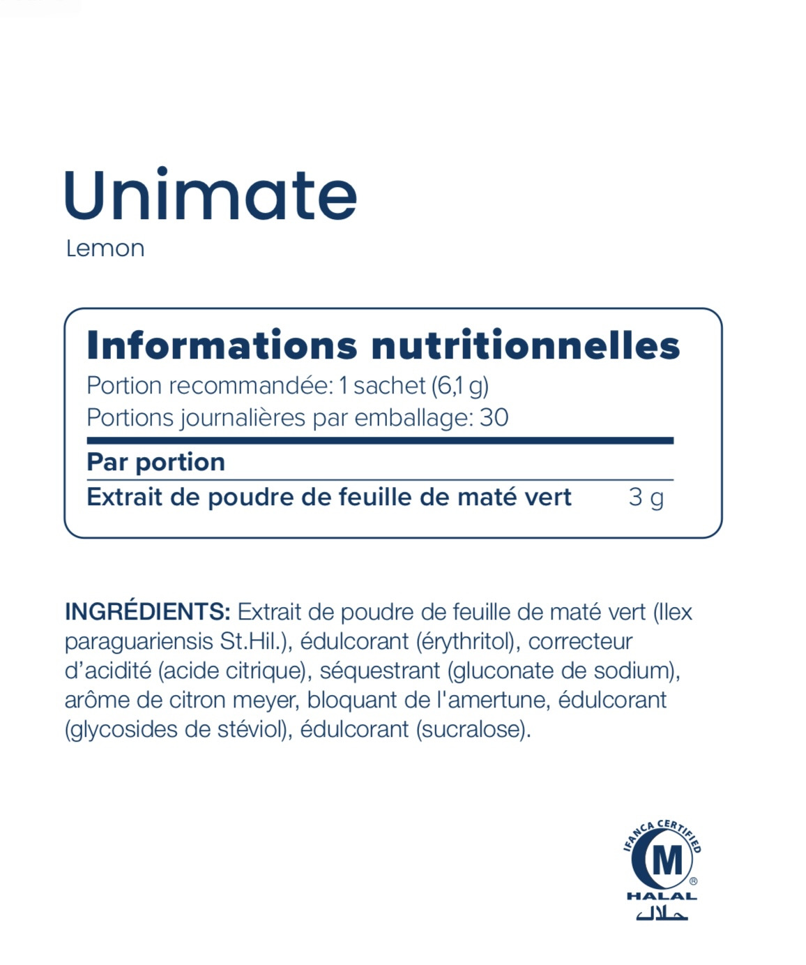 Unimate Citron Gingembre d’Unicity est une boisson fonctionnelle à base de yerba maté, enrichie en extraits naturels de citron Meyer et de gingembre. Elle est conçue pour stimuler l’énergie mentale, améliorer l’humeur et favoriser la concentration, tout en s’intégrant parfaitement dans un mode de vie actif ou un programme de jeûne intermittent.