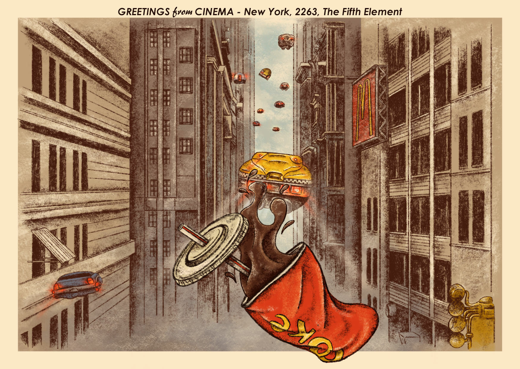 Carte Postale GREETINGS from CINEMA - New York, 2263, The Fifth ElementImpression en France A6 couché mat 310 g/m² avec pelliculage soft touch au recto.